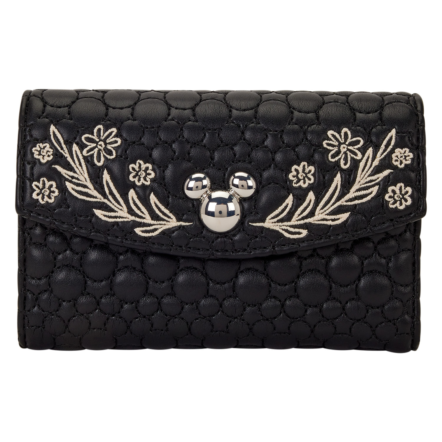 Questo portafoglio presenta un motivo trapuntato con le sagome Topolino . La patta superiore presenta un ciondolo in metallo raffigurante una sagoma Topolino affiancata da dettagli ricamati di fiori e foglie. All'interno, ci sono sette scomparti per carte di credito e uno scomparto trasparente per un documento d'identità. È l'accessorio Disney perfetto per accompagnarti per tutto il giorno!