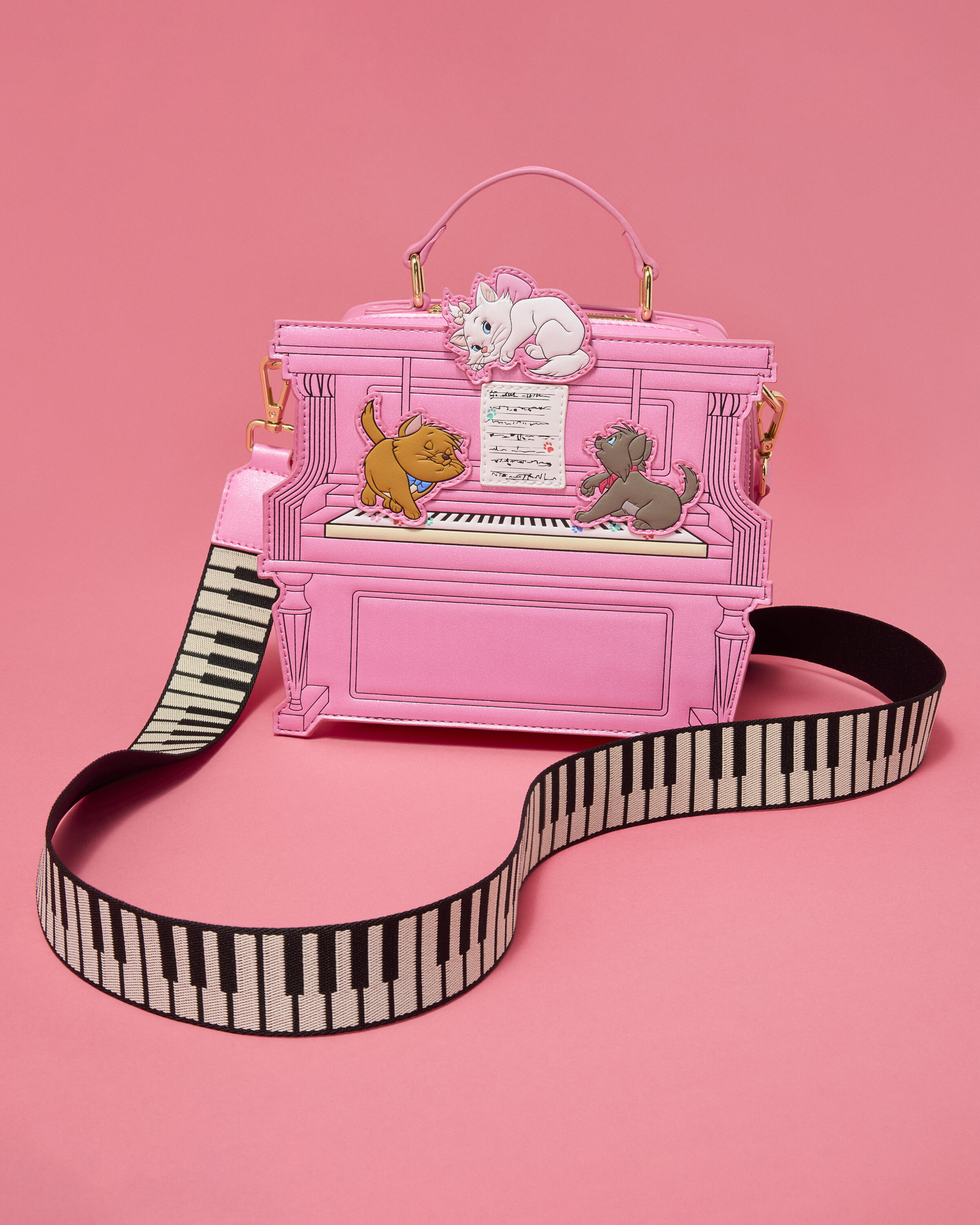 Questa sac bandoulière figurativa ha la forma di un pianoforte. Troverai Toulouse, Marie e Berlioz al pianoforte, mentre Duchessa e Thomas O'Malley ballano sul retro! I glitter rosa rendono questa borsa davvero speciale!