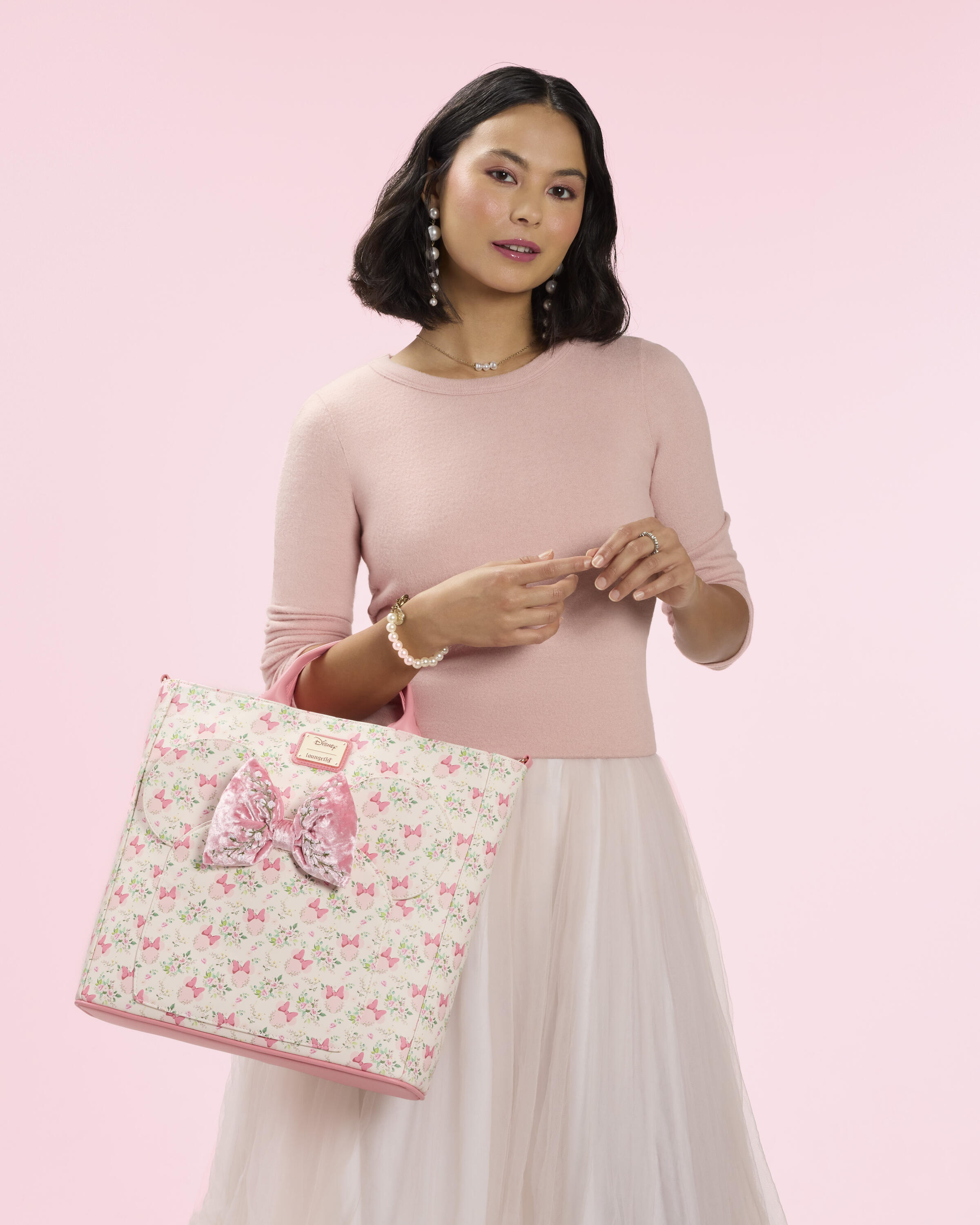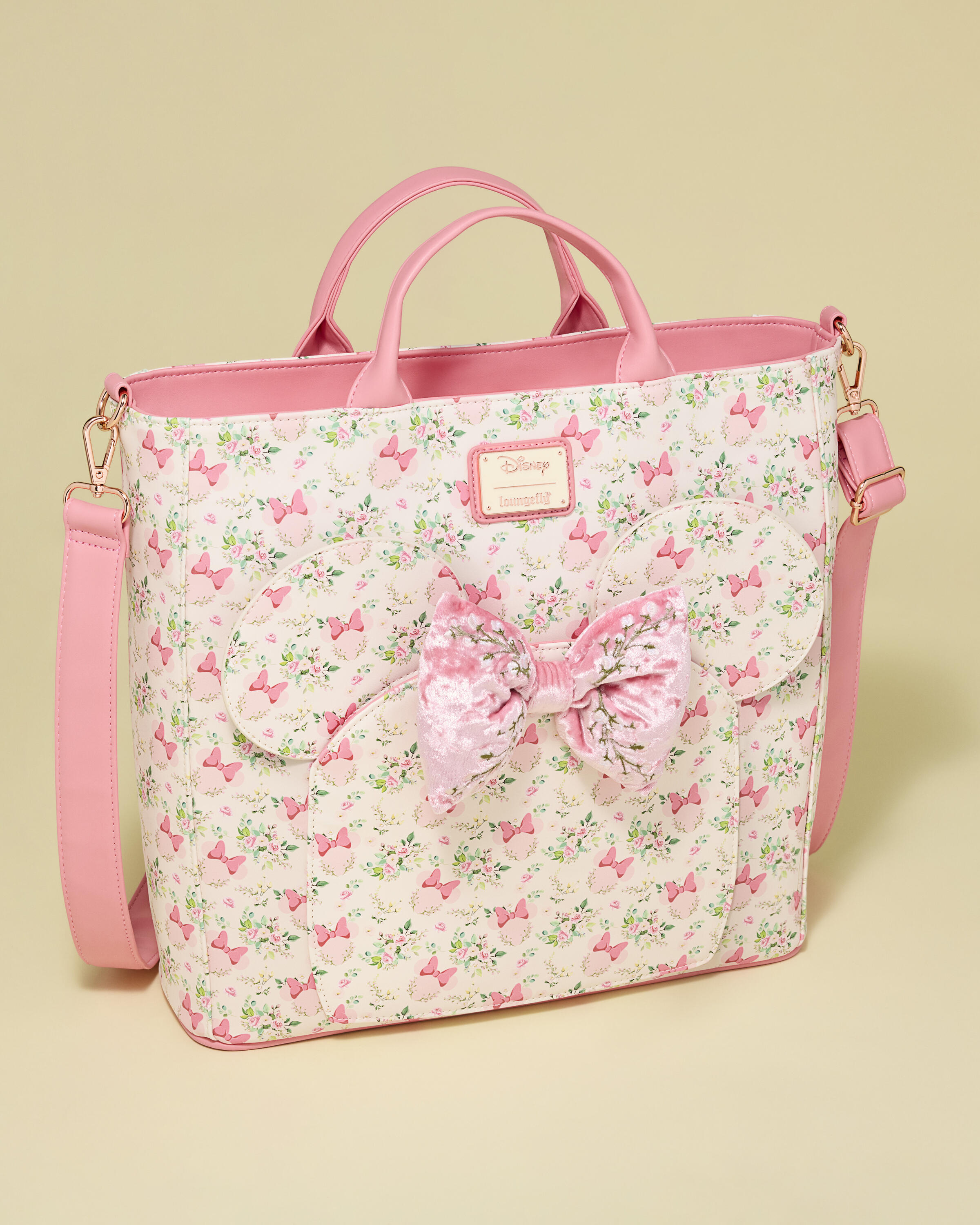 Troverai una stampa della silhouette di Minnie Disney circondata da motivi floreali. Sul davanti, troverai orecchie Paperina applicate con un fiocco di velluto al centro. Questa borsa si trasforma facilmente da zaino a sac tote, così puoi cambiare il tuo look come preferisci!