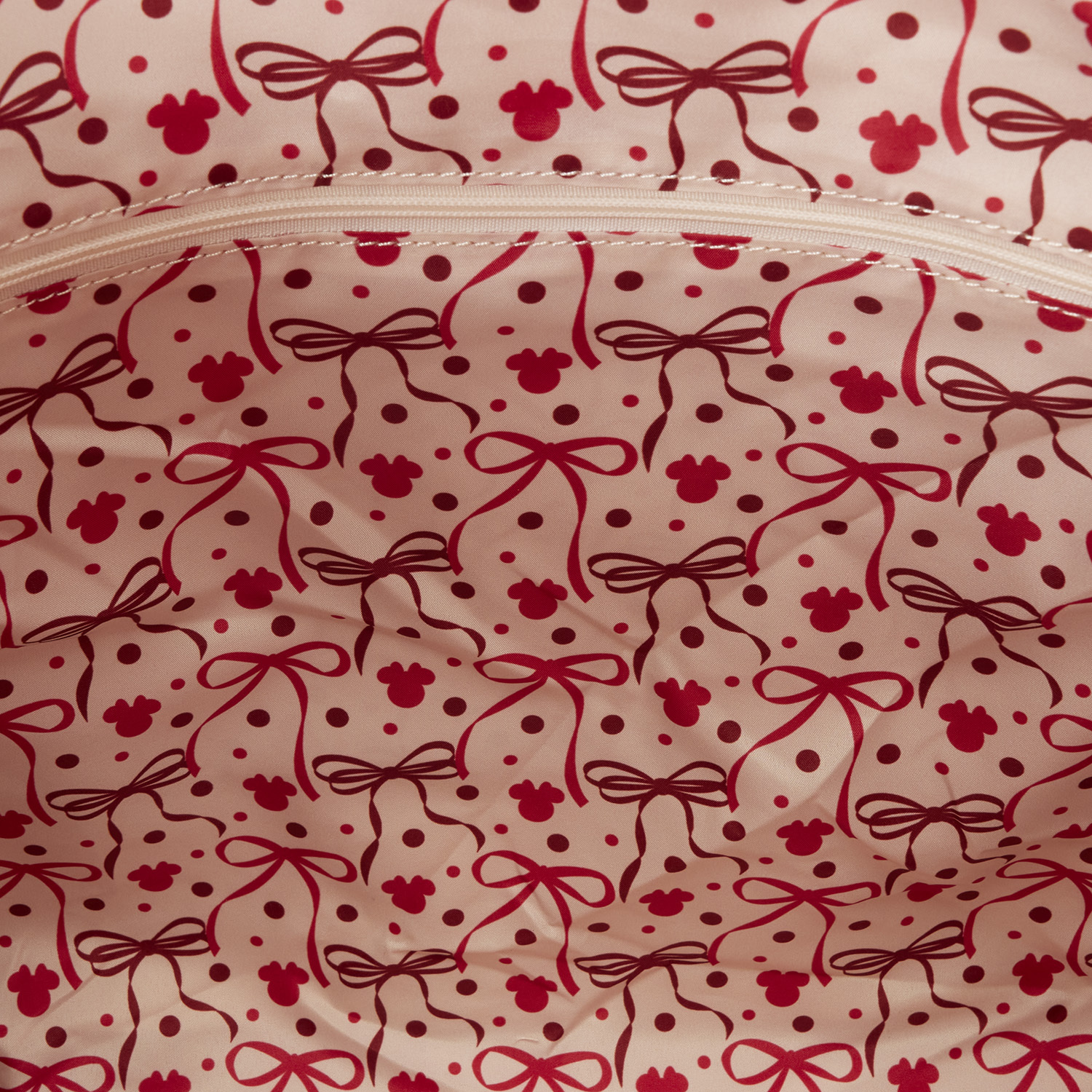 Questa tote bag è rossa e crema. Troverai pois in rilievo su tutta la borsa. Troverai pois anche sul fiocco 3D di Minnie e sulle tracolle! La tasca frontale ha la forma della silhouette di Minnie. I nastri di raso aggiungono un tocco di dolcezza in più alla borsa! Incarna la tua fashionista Disney preferita con questa borsa!