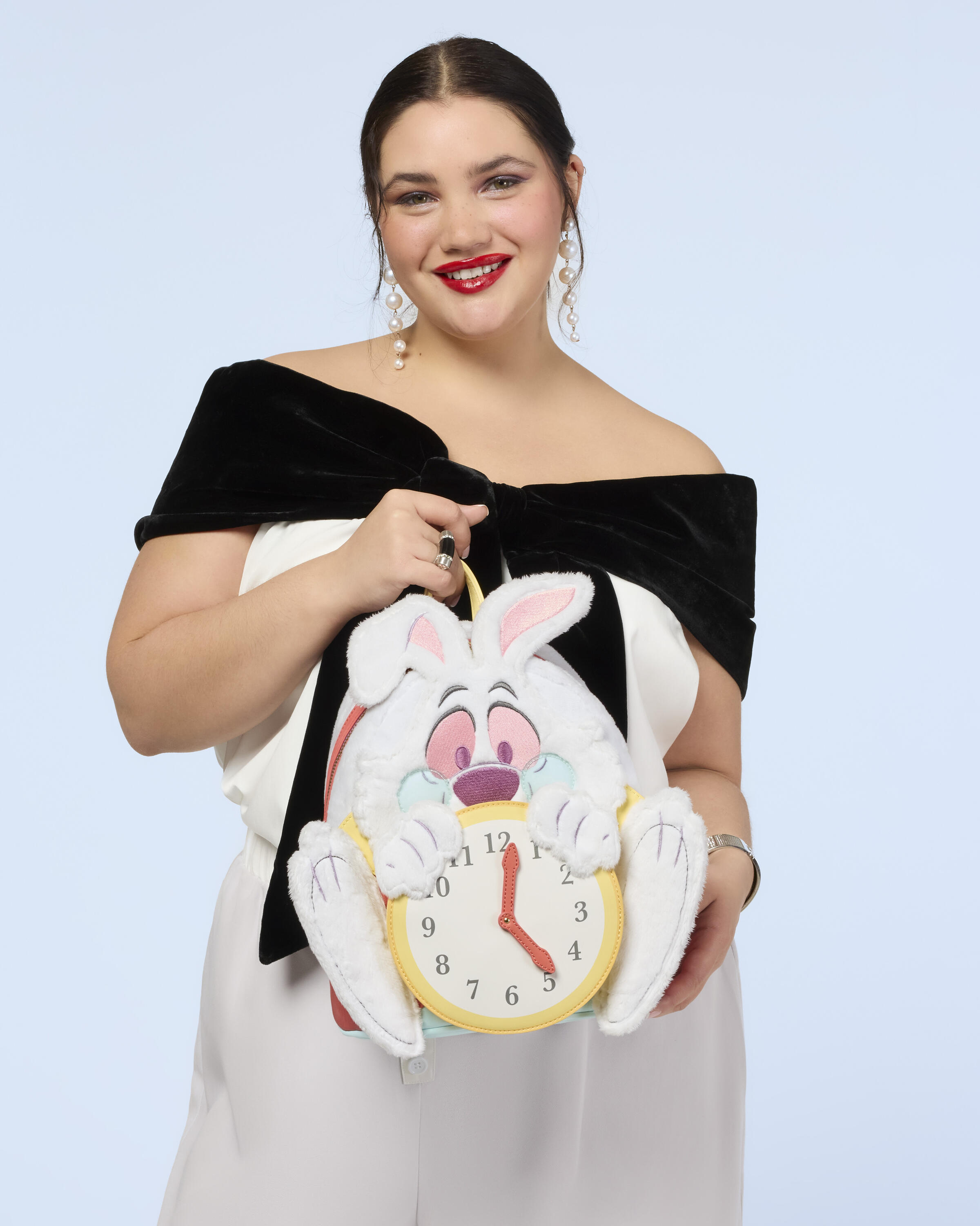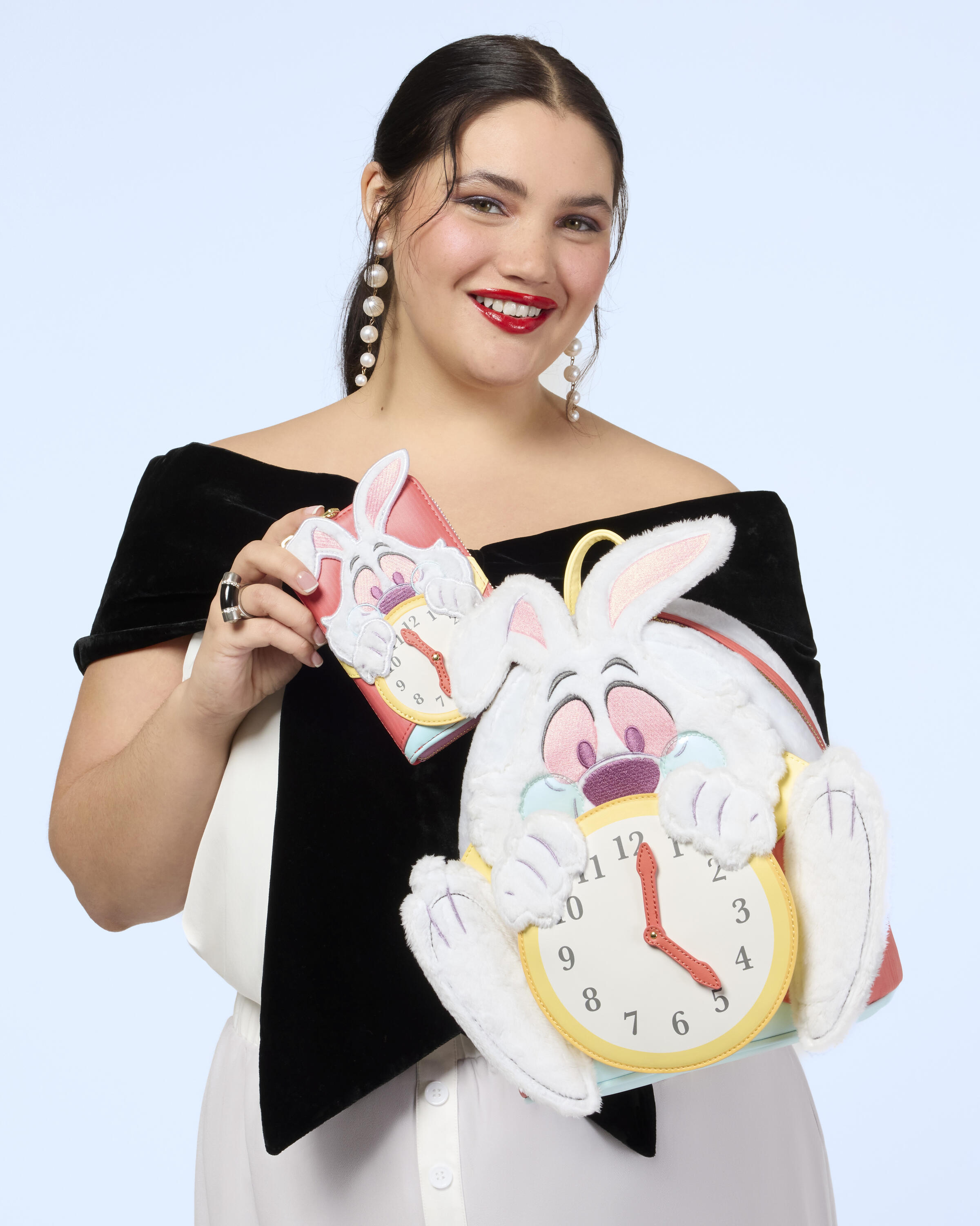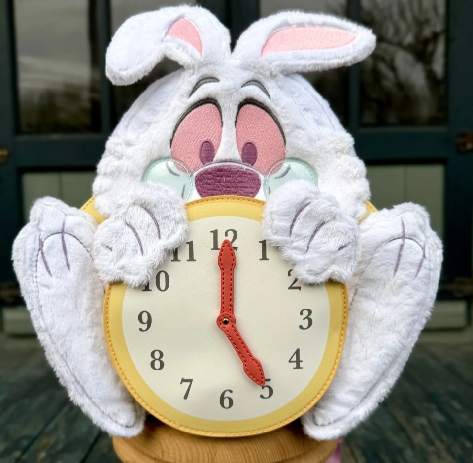 Questo mini zaino è pronto per qualsiasi appuntamento importante! Presenta il Bianconiglio di Alice nel Paese delle Meraviglie della Disney. Troverai pelliccia sintetica, dettagli del viso ricamati, PVC e dettagli in peluche sulla borsa per dare vita al coniglio. Tiene in mano un orologio e le lancette girano su un rivetto! Lasciati trasportare dallo stile!