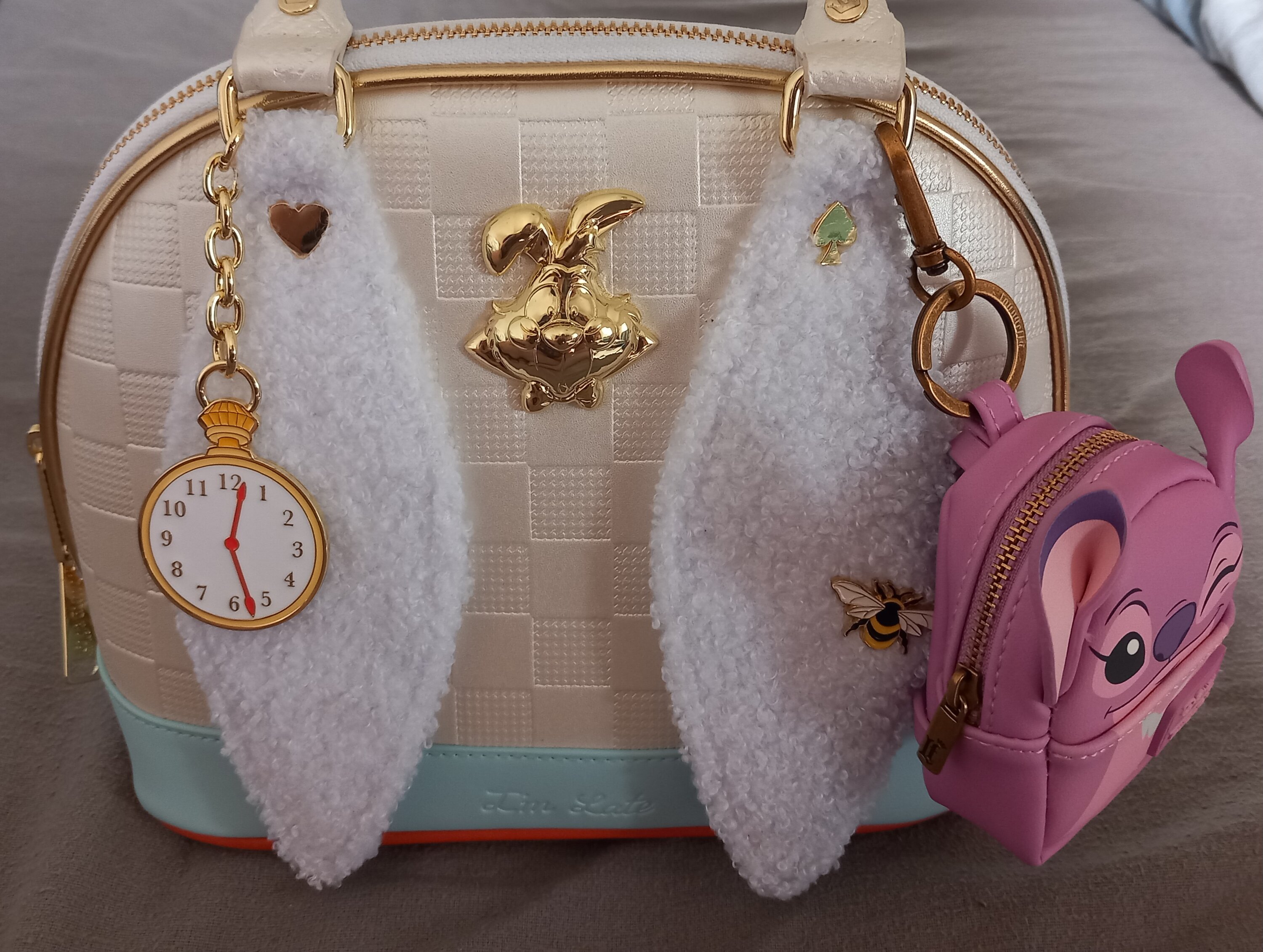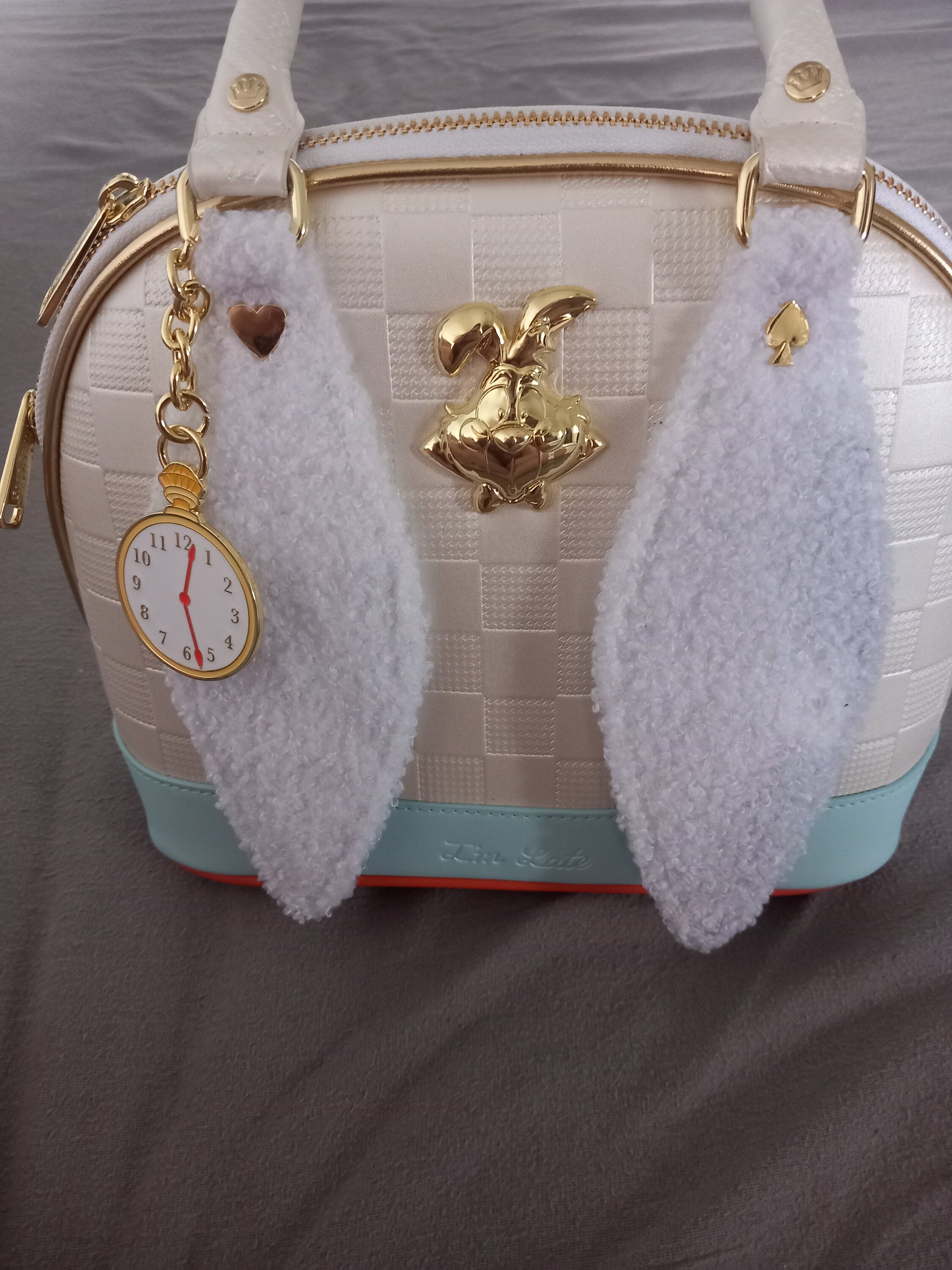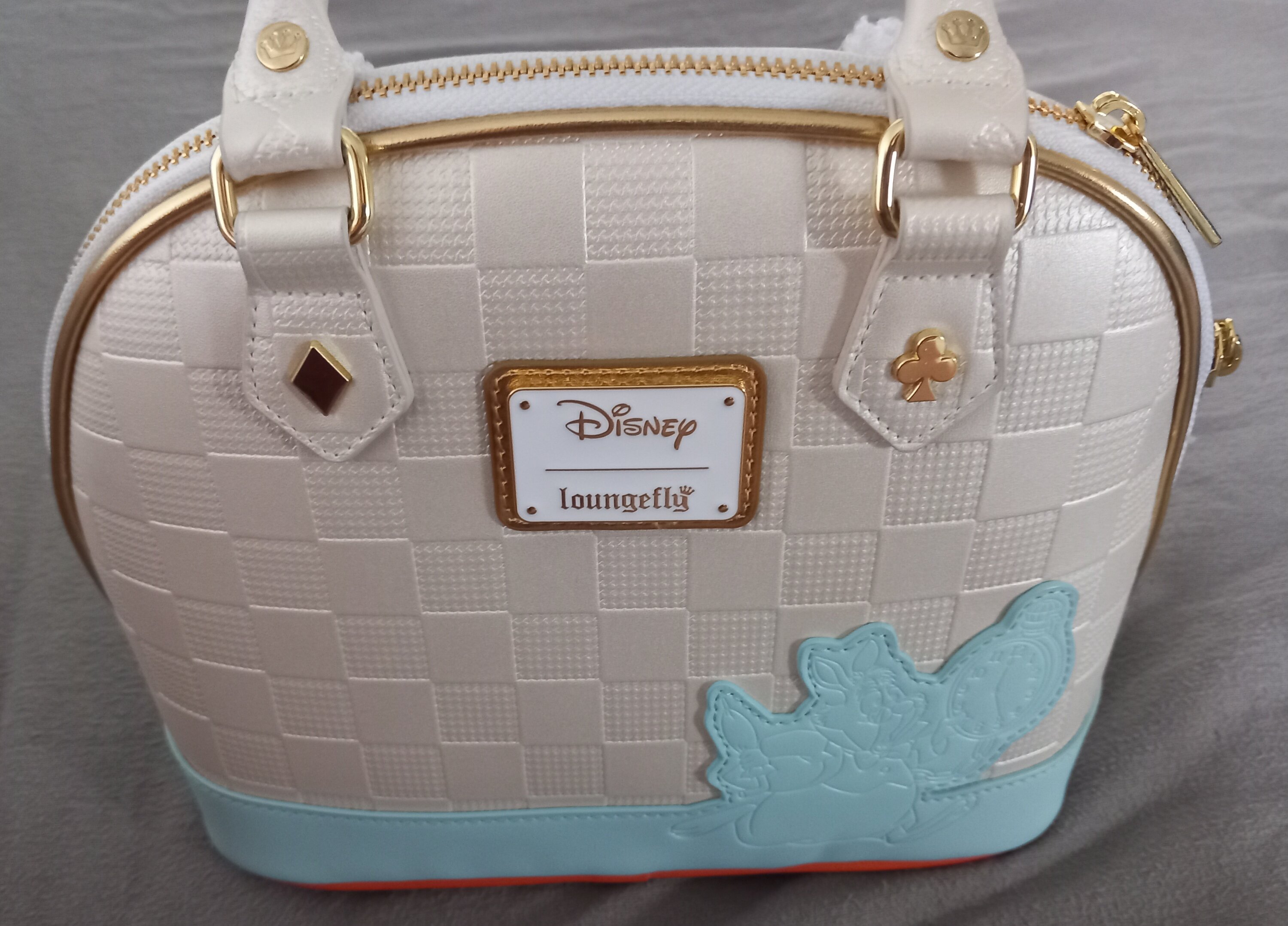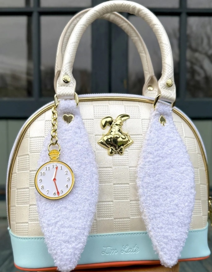 Questa borsa è ispirata al Bianconiglio di Alice nel Paese delle Meraviglie della Disney. Troverai un motivo a scacchiera bianco e grigio su tutta la borsa. Una striscia blu lungo la base recita "Sono in ritardo". Troverai un ciondolo in metallo 3D modellato raffigurante il coniglio su un lato e un'applicazione blu raffigurante il coniglio sul retro con dettagli in rilievo. Due applicazioni in sherpa si estendono dal manico superiore, a forma di orecchie di coniglio! Troverai anche un ciondolo a forma di orologio attaccato!