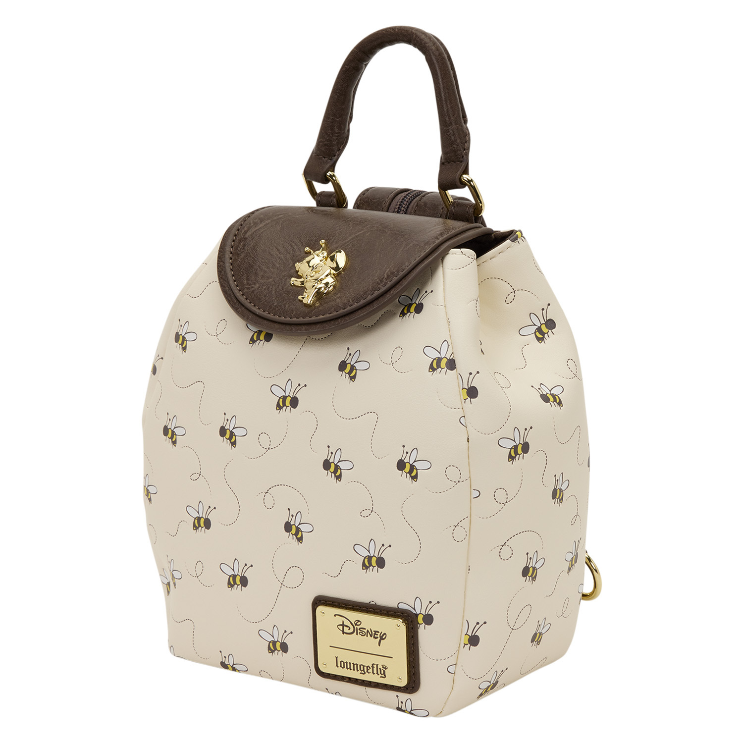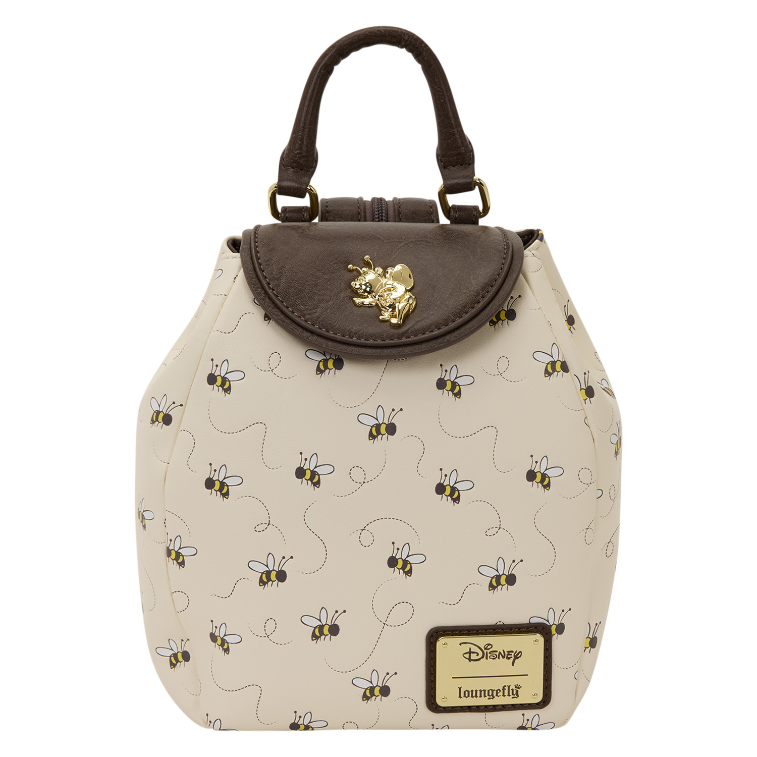 Questo mini zaino è più piccolo del nostro tradizionale mini zaino. È decorato con un motivo a rilievo di api che ronzano. La patta superiore presenta un ciondolo in metallo 3D di Winnie the Pooh! La borsa si trasforma da mini zaino a tracolla unendo le due metà della tracolla con una cerniera!