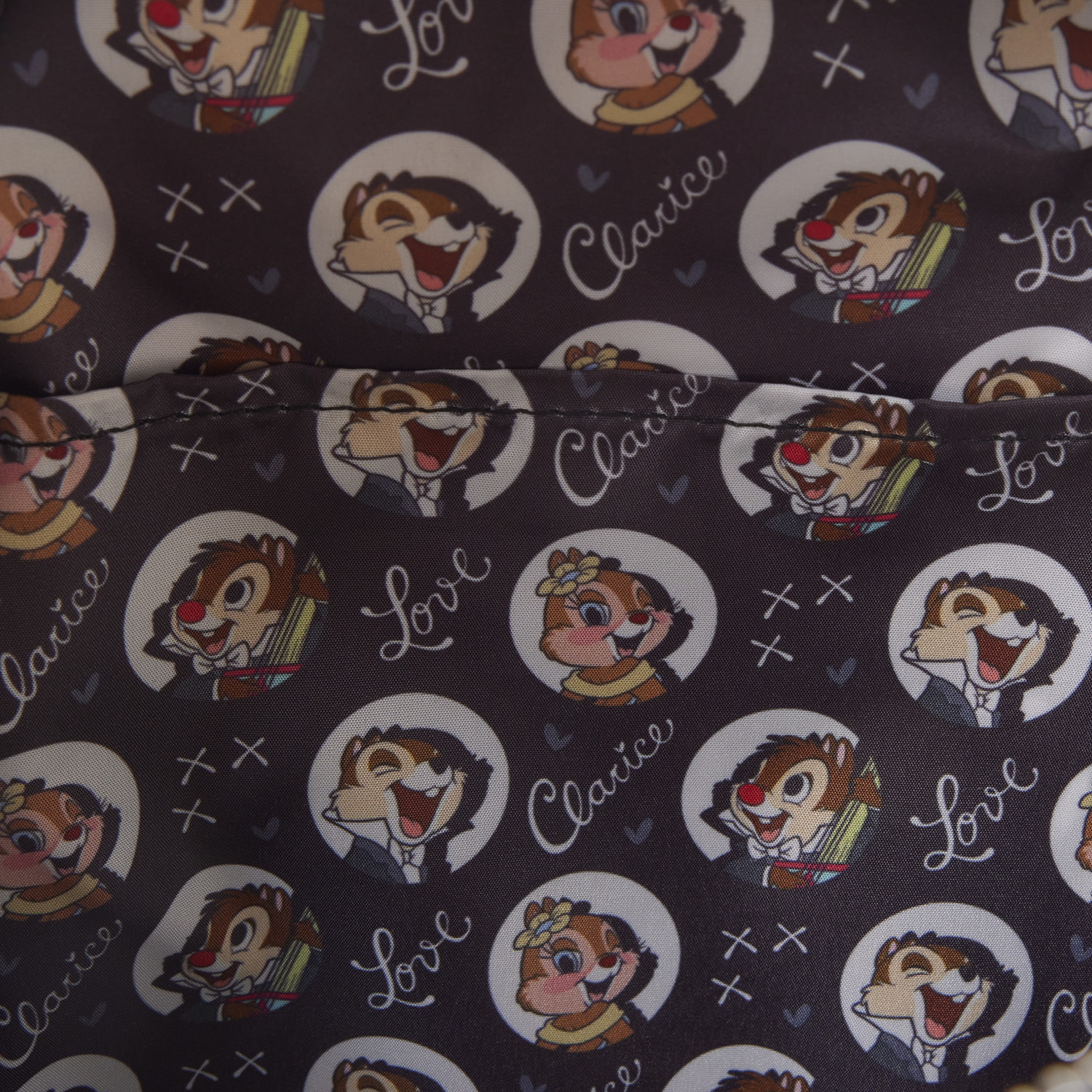 Troverete Cip & Ciop sulla parte anteriore della borsa, uno sopra l'altro. Presentano dettagli del viso ricamati e sono realizzati in morbido materiale. Il resto della borsa è ispirato ai loro abiti. Sul lato, troverete un'immagine di Clarice autografata da lei. Per un tocco extra di dolcezza, il tiretto della cerniera è un cappello a cilindro!