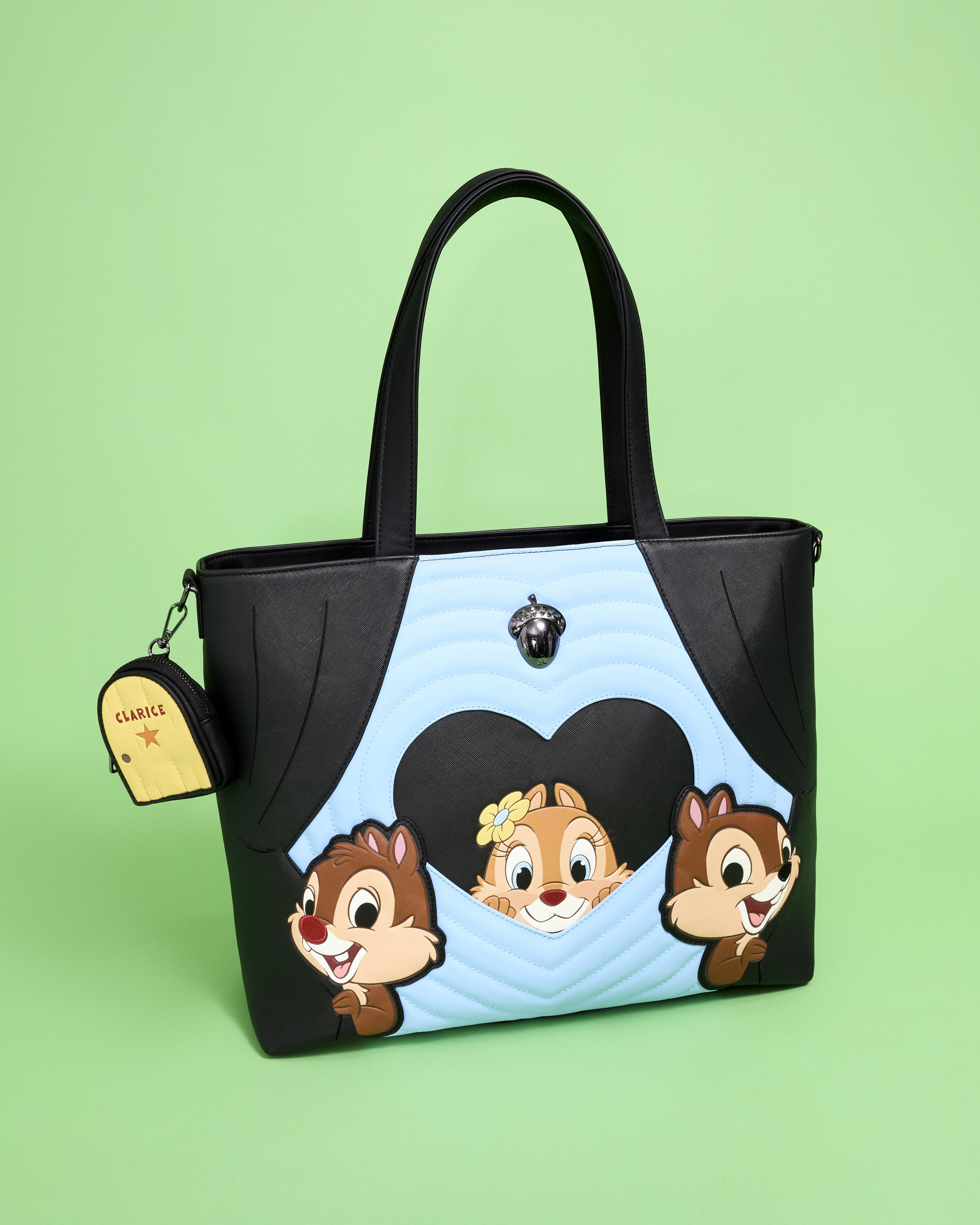 Questa sac tote è ispirata al cortometraggio Cip e Ciop. Troverete Clarice in primo piano all'interno di una cornice blu a forma di cuore. Cip e Ciop appaiono ai suoi lati dietro delle tende nere da teatro. Girate la borsa per trovare un'altra immagine di Clarice sul retro. Il materiale trapuntato, le applicazioni imbottite, il morbido poliuretano e i dettagli ricamati rendono questa borsa davvero speciale. Attaccata alla tracolla, troverete un portamonete a forma della porta del camerino di Clarice.