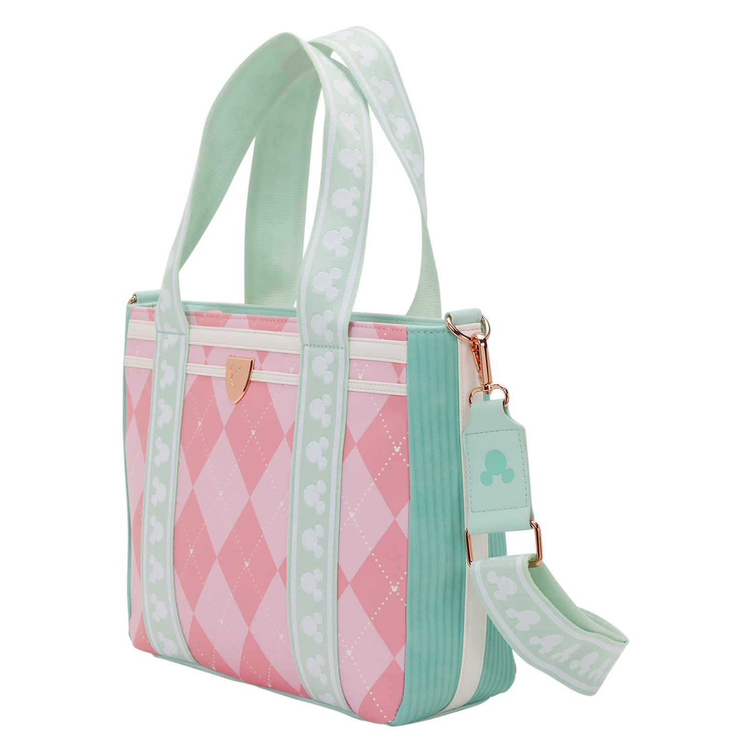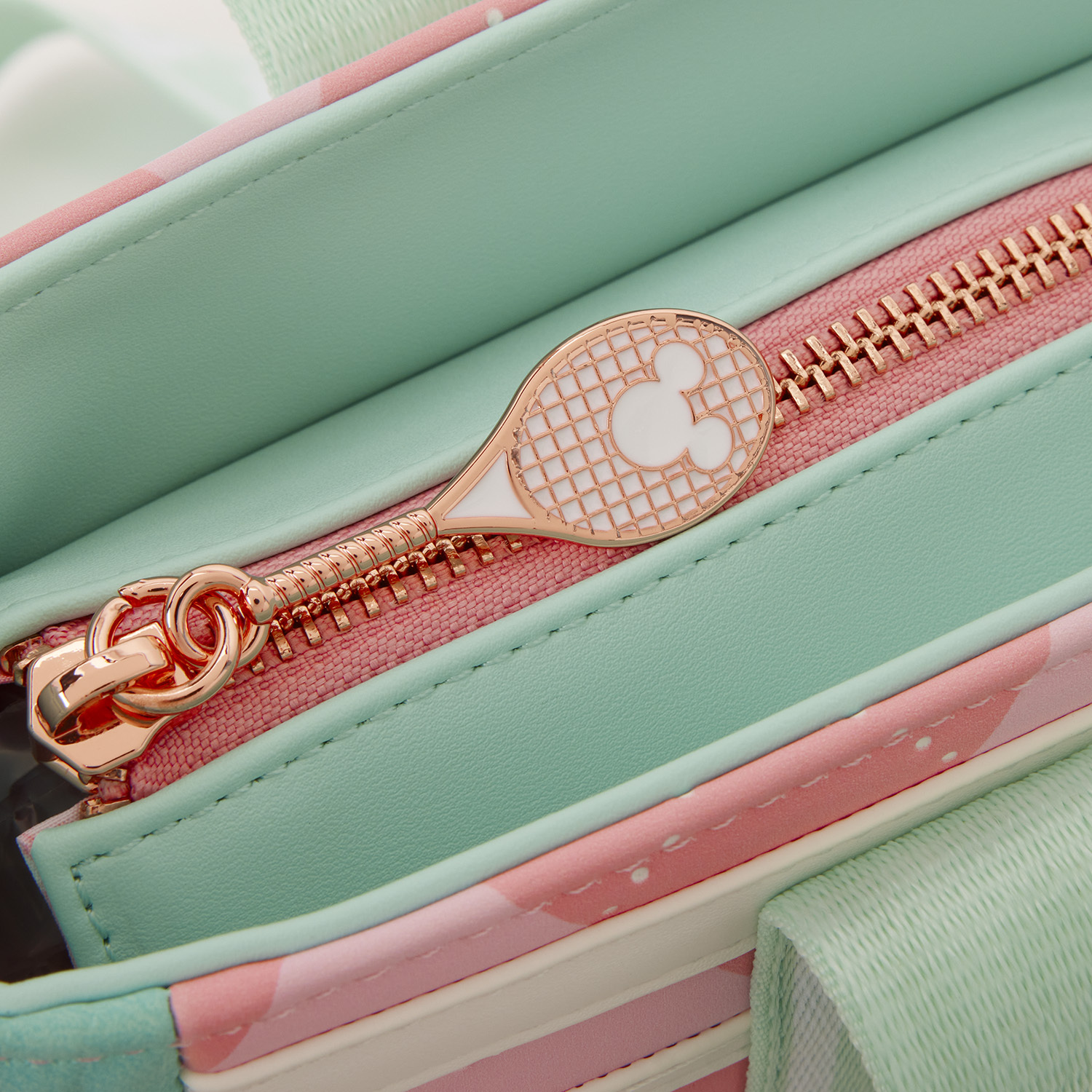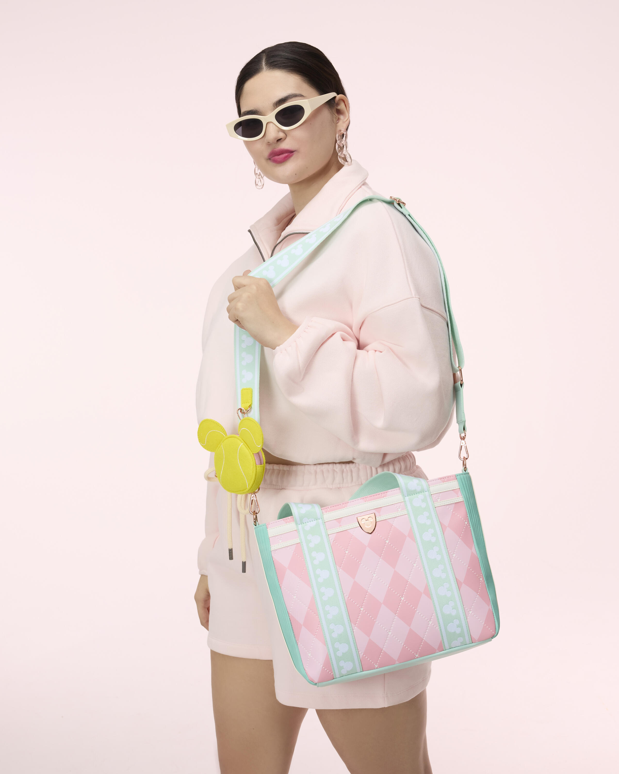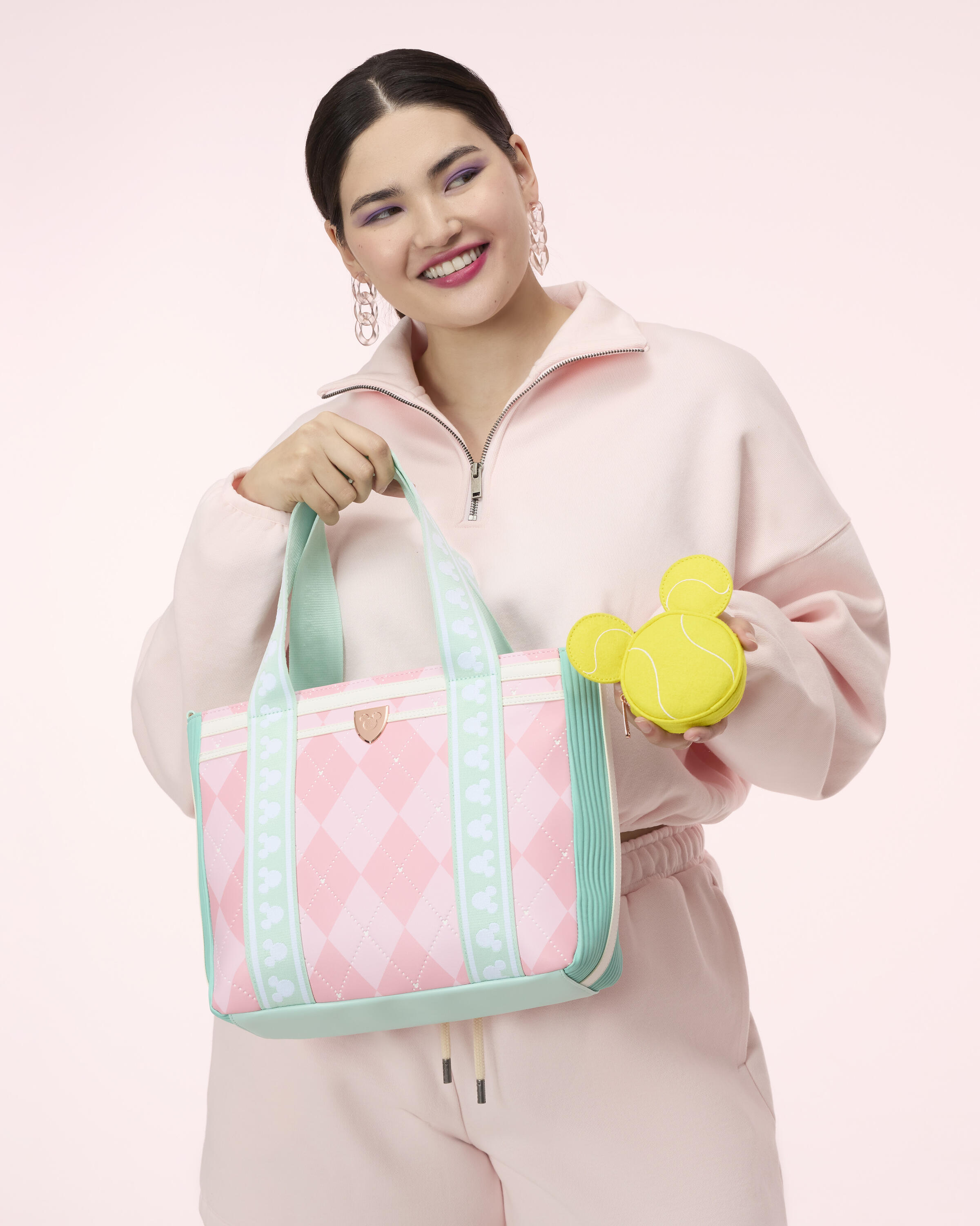 Questa adorabile borsa tote unisce lo stile Disney alla moda del tennis. Troverai un motivo a rombi rosa su questa borsa tote con un ciondolo in metallo sagomato in 3D con la silhouette Topolino al centro. Le tracolle presentano un motivo ripetuto di silhouette Topolino e il portamonete sembra una pallina da tennis a forma di silhouette di Topolino!