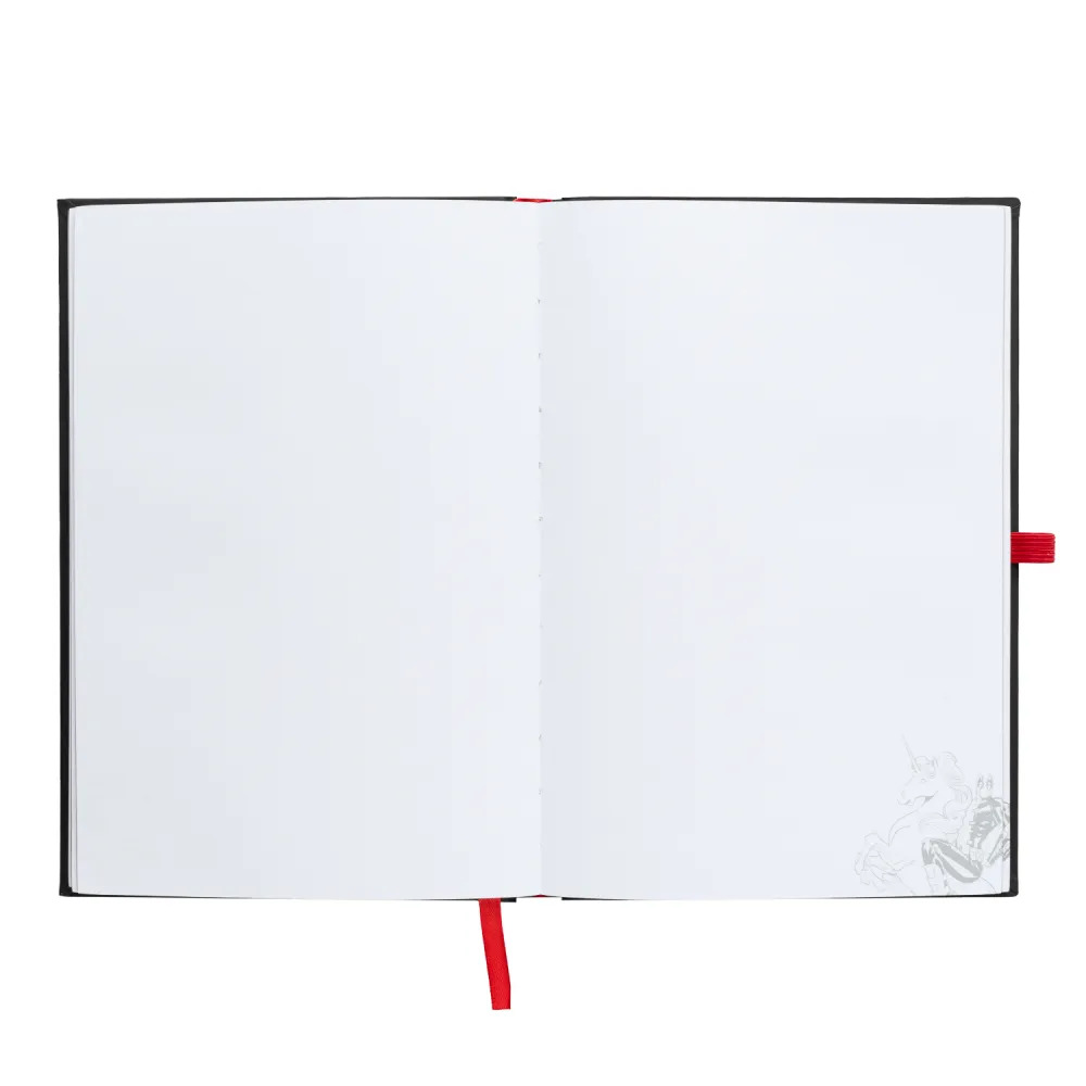 Quaderno A5 (14,8 x 21 cm) con luce LED. Presenta una copertina rigida morbida al tatto, angoli squadrati, rilegatura incollata, interno personalizzabile a forma di proiettile, un segnalibro a nastro, una tasca interna e un passante elastico per penna. L'interno contiene 96 fogli (192 pagine) di carta da 100 g/m². La copertina si illumina premendo un pulsante in basso al centro. Funziona con tre batterie LR1130 da 1,5 V (incluse).