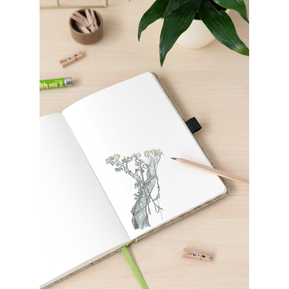 Quaderno A5 con copertina rigida e penna proiettore integrata.