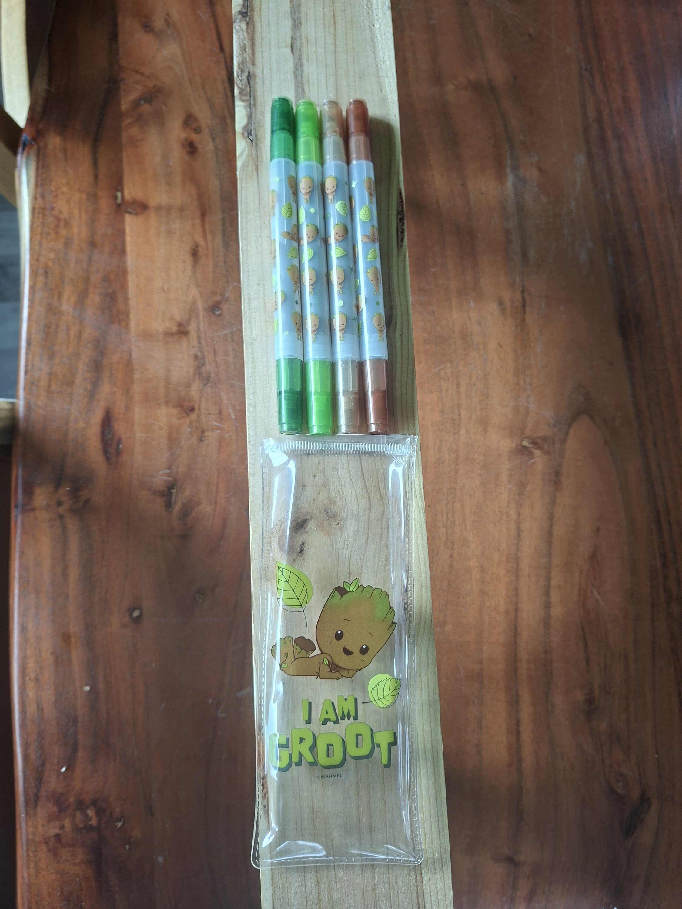 Die vier Textmarker in schönen Naturtönen (Grün und Braun) machen optisch mit den Baby-Groot-Motiven wirklich was her. Sie markieren sauber und sind ein echtes Highlight auf dem Schreibtisch. Das Etui ist leider keine dauerhafte Tasche. Man muss die Plastikhülle oben aufschneiden, um an die Marker zu kommen, und kann sie danach nicht wieder verschließen.