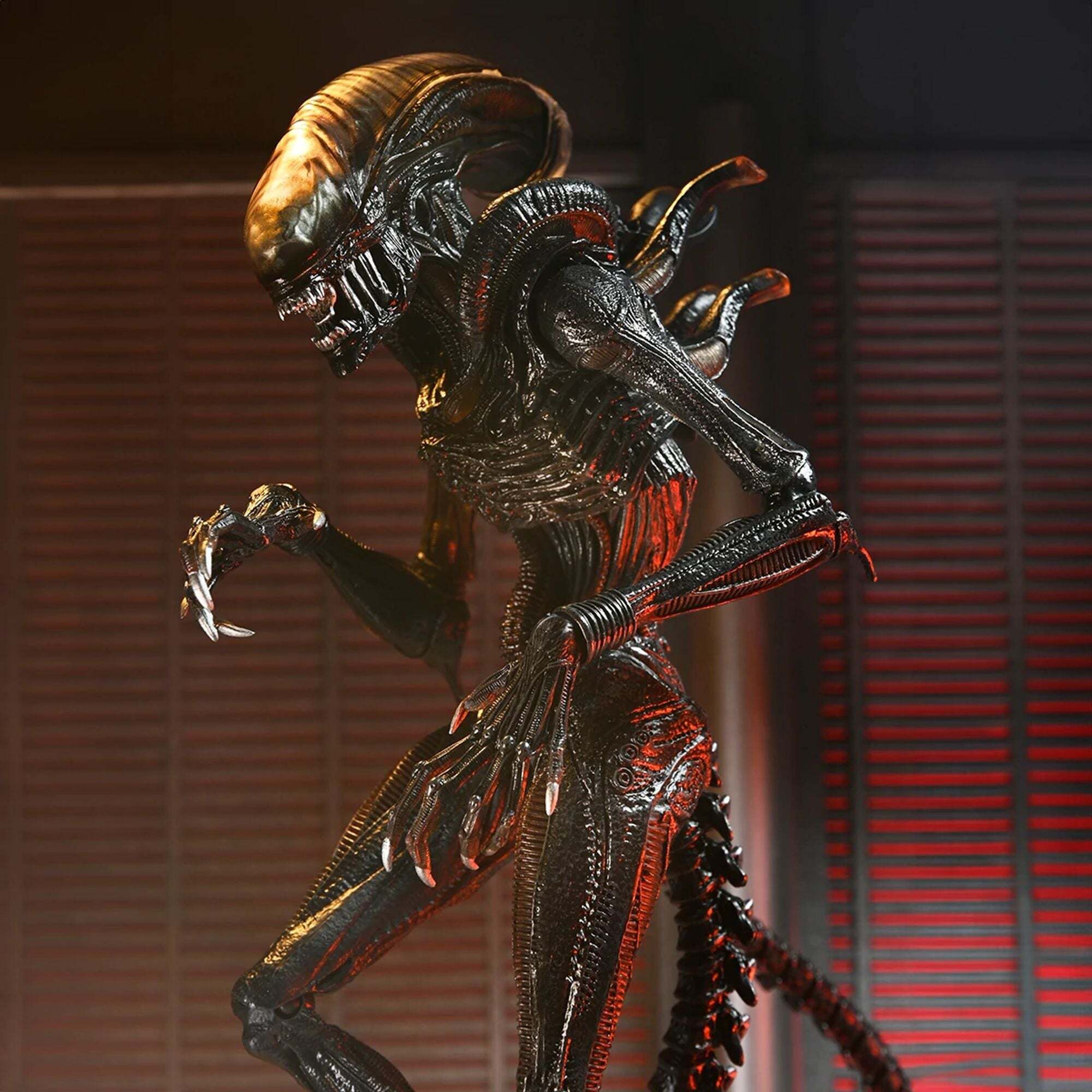 L'action figure NECA definitiva dello Xenomorfo Scorched è alta oltre 18 cm, con 23 punti di articolazione e presenta una mascella apribile con una bocca interna estensibile e una coda articolata.