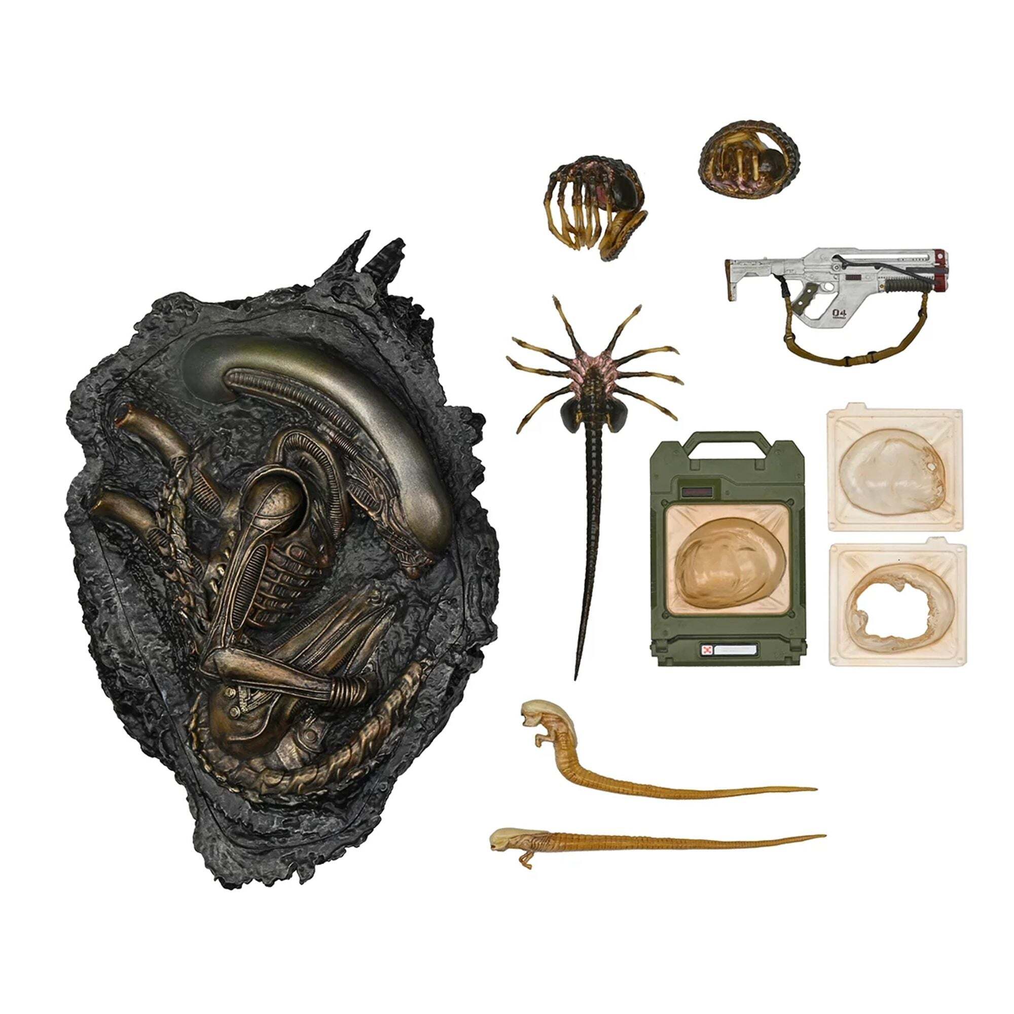 Due Facehugger, incluso uno che può avvolgere la testa della maggior parte dei personaggi NECA in scala da 7" (personaggio non incluso).