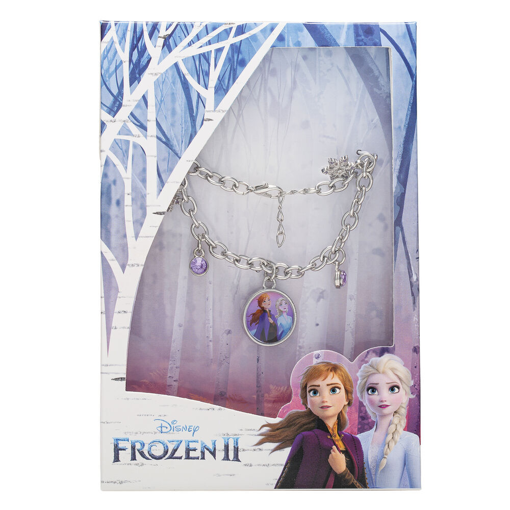 La catena in argento è completata da un ciondolo in smalto raffigurante Anna ed Elsa e da ciondoli in argento a forma di fiocco di neve, nonché da un ciondolo con pietra viola.