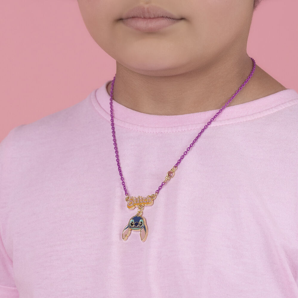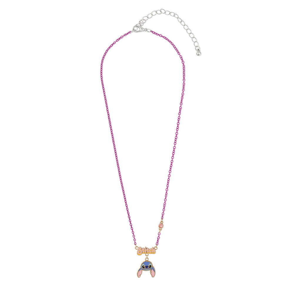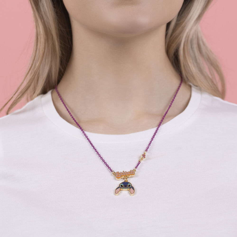 Presenta Stitch con un ciondolo a forma di goccia e una catena viola.
