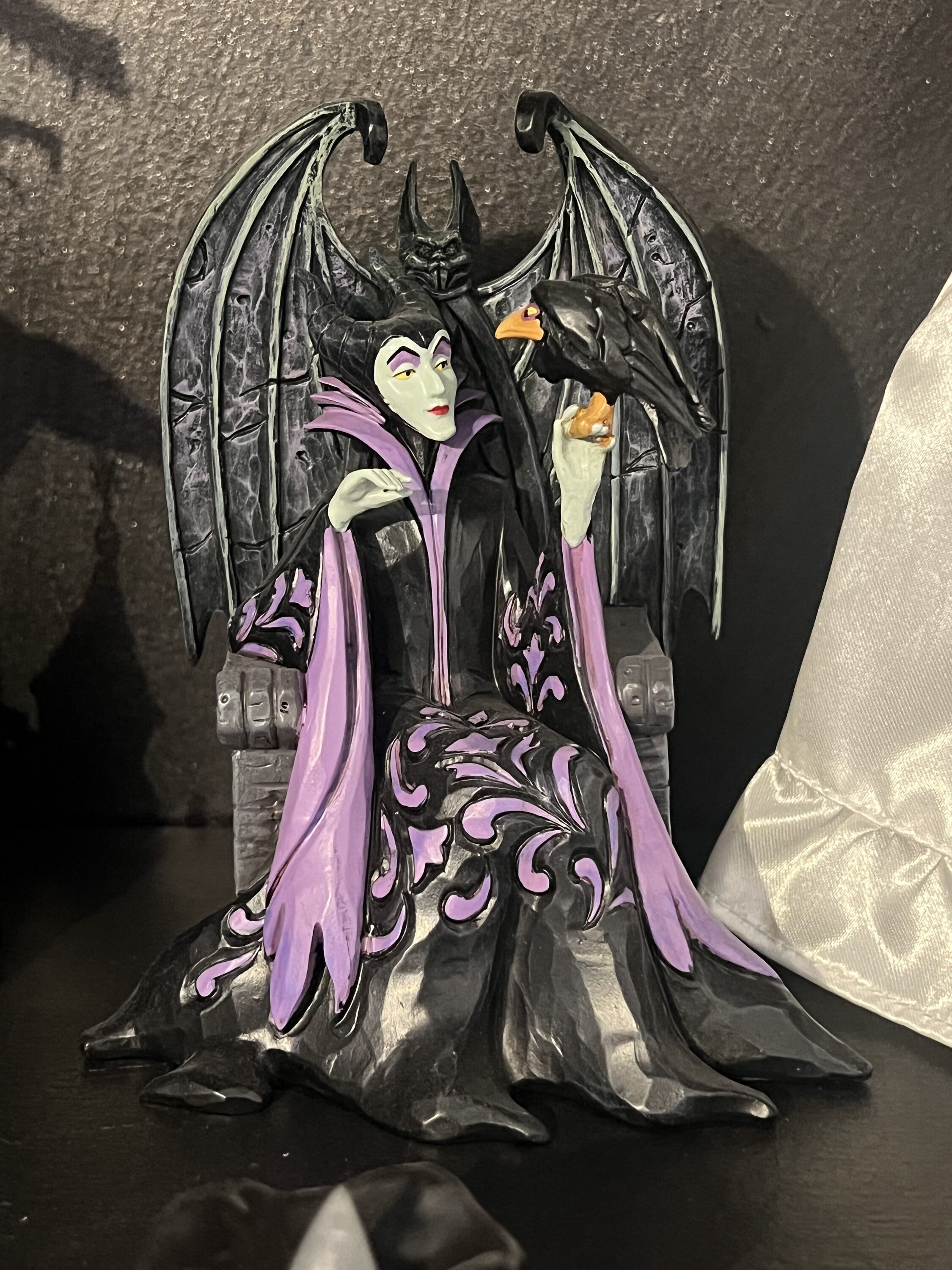 Malefica siede sul suo trono con il suo corvo, Diaval. Vestita con il suo famoso abito nero e il copricapo con le corna, è in ogni modo l'emblematica cattiva della Bella Addormentata. Progettata da Jim Shore per la sua collezione Disney Traditions, è dipinta a mano e viene fornita in una confezione firmata.