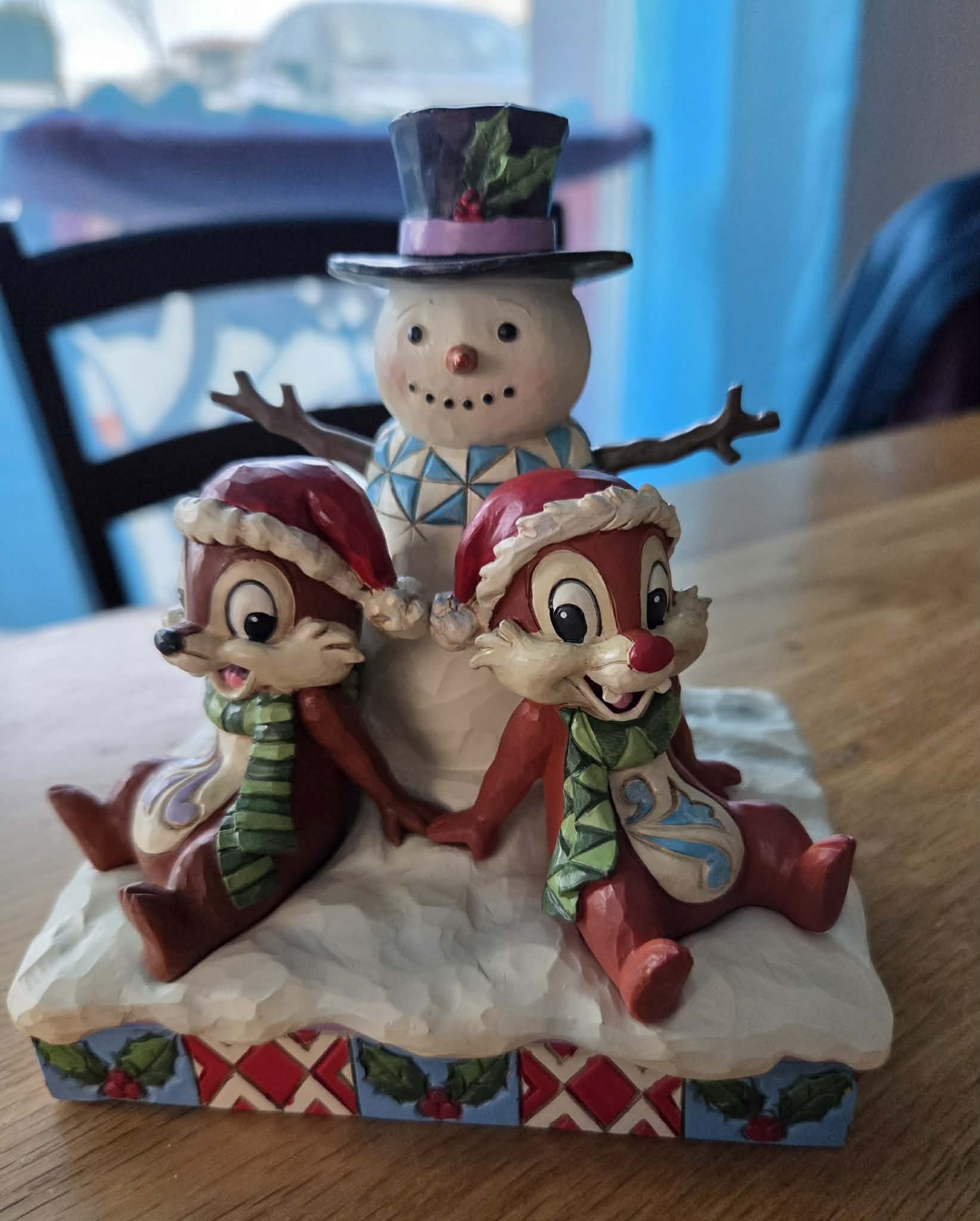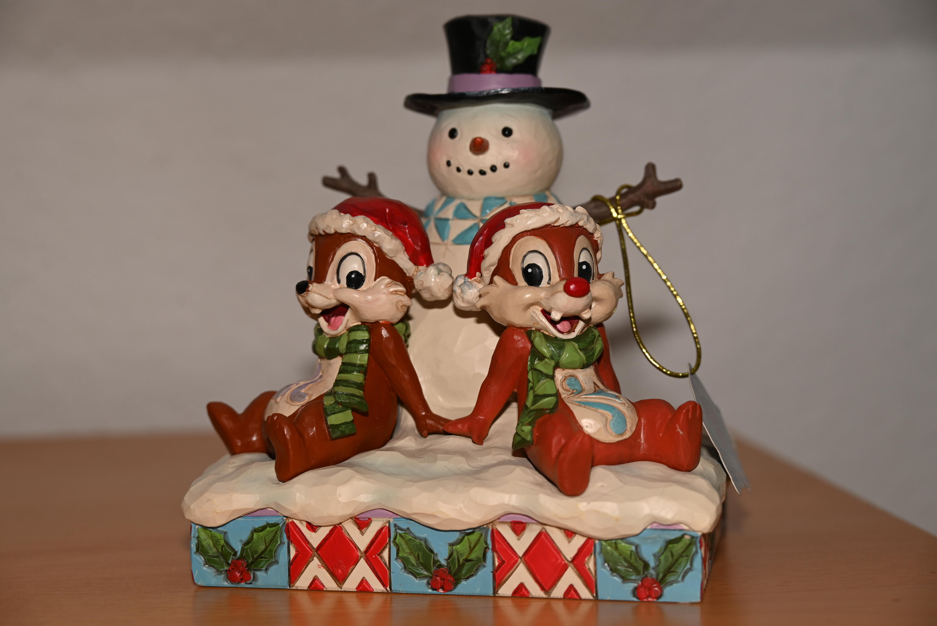Superbe figurine de Tic et Tac accompagnés d'un bonhomme de neige, idéal en déco de Noël