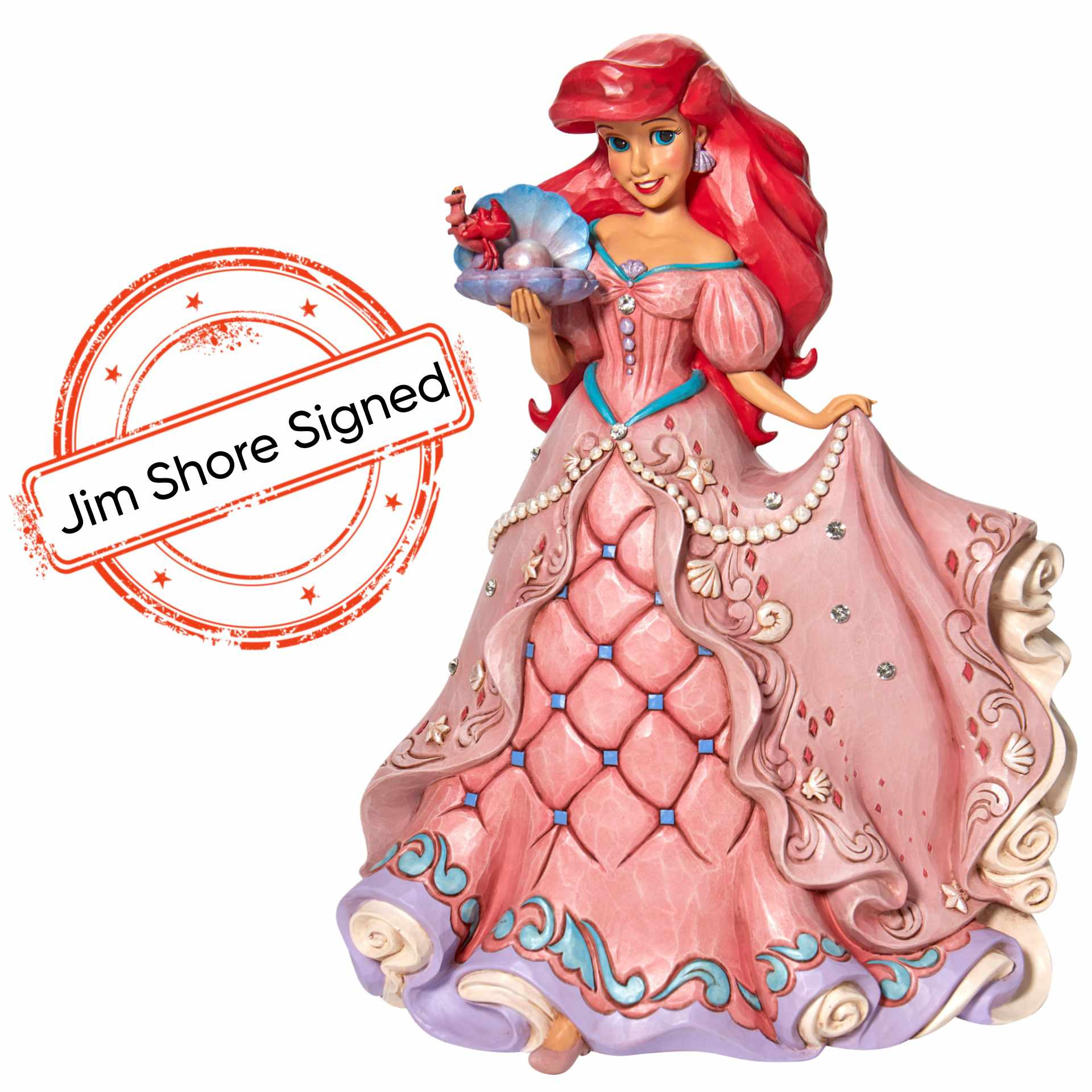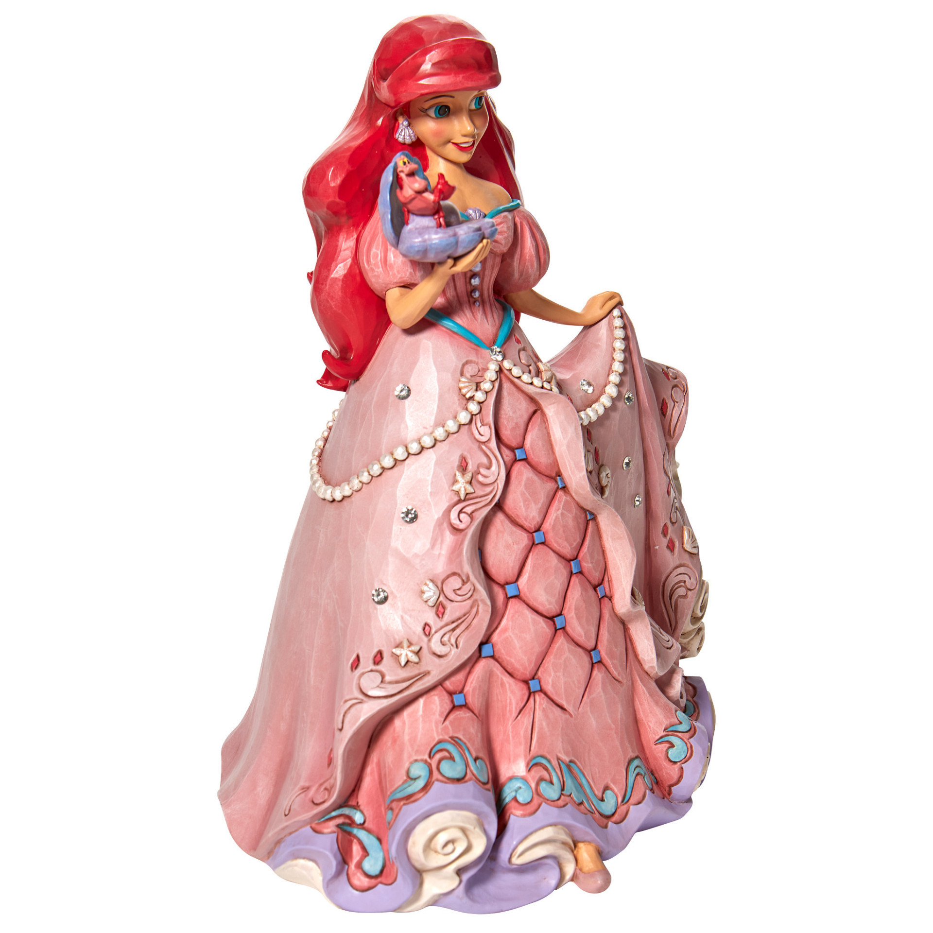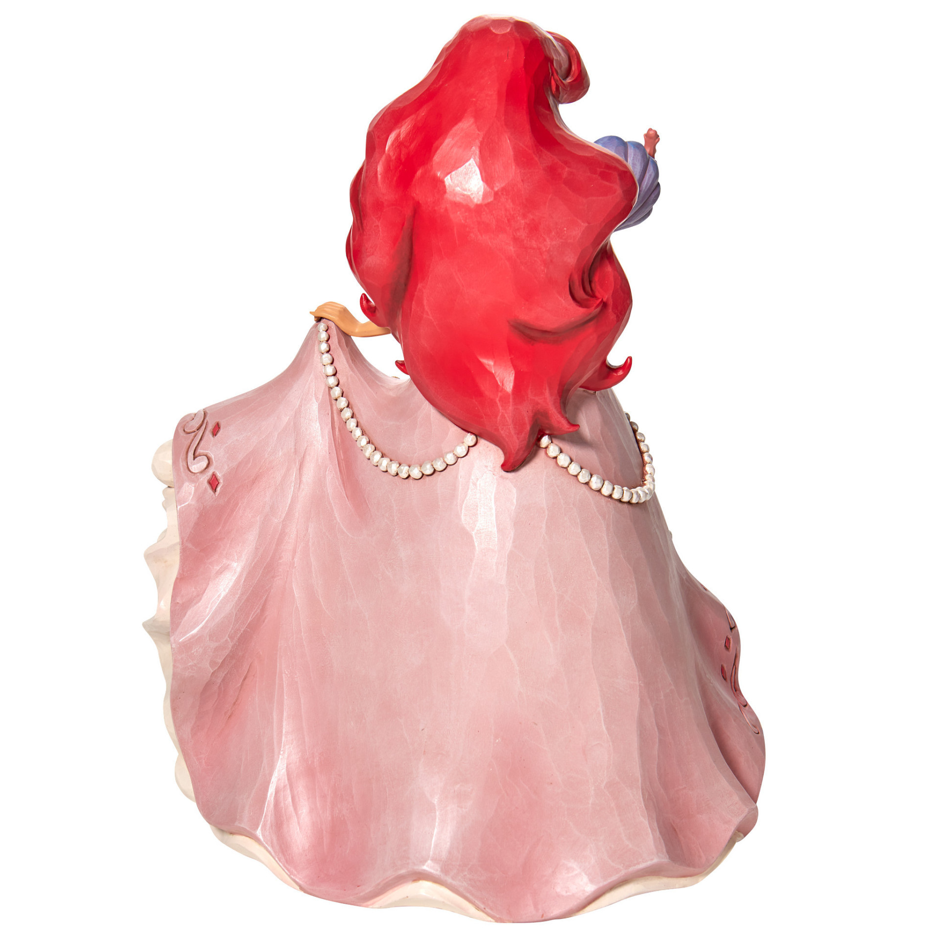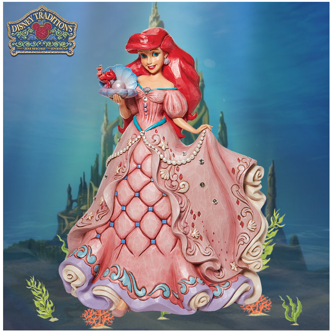 Secondo della serie Enchanted Princesses, questo design Jim Shore presenta Ariel in uno splendido abito decorato con conchiglie e gioielli, che tiene in mano un'ostrica con una perla.