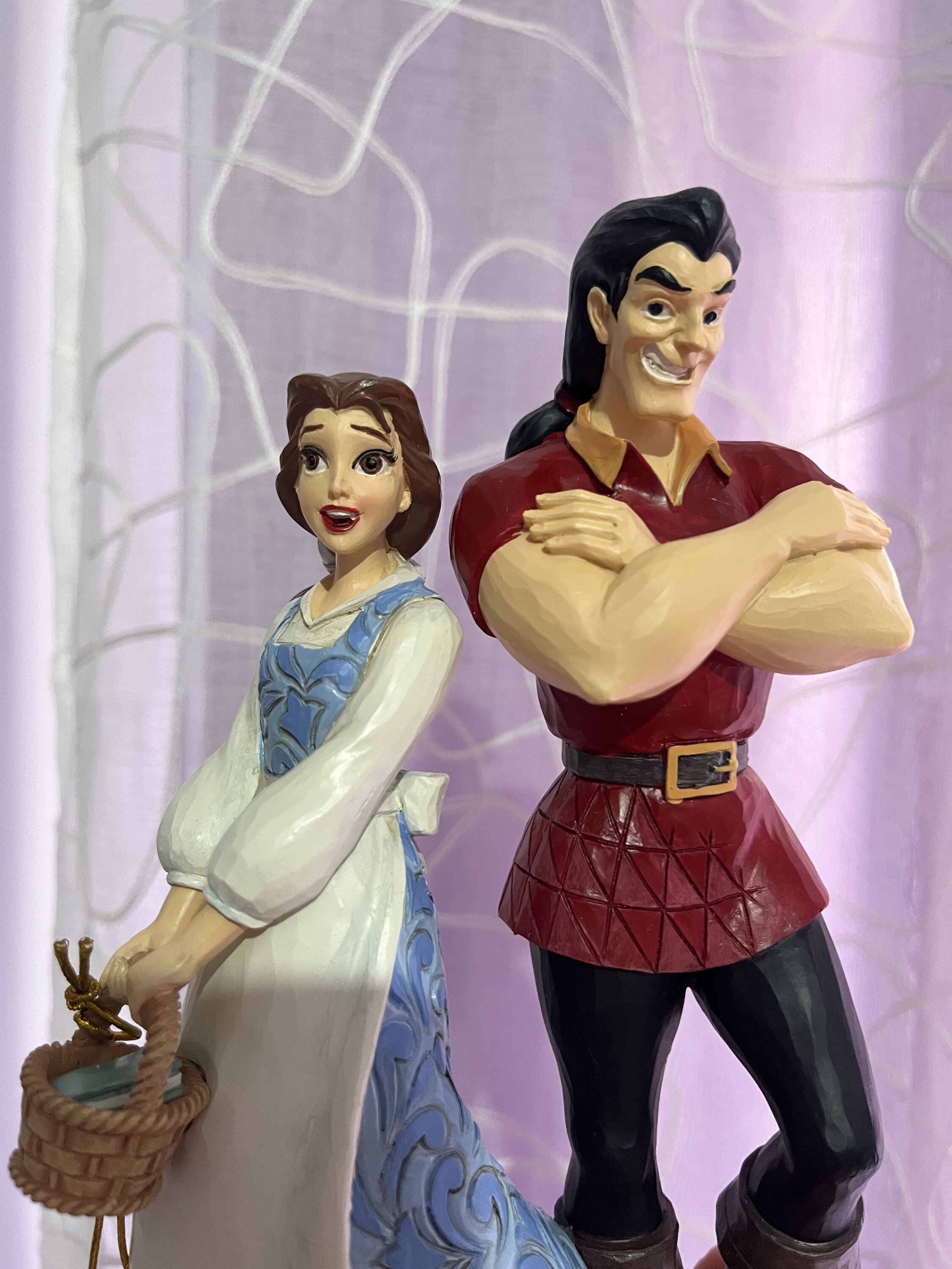 In un sorprendente ritratto di contrasto, Jim Shore raffigura Belle e Gaston in piedi fianco a fianco, ciascuno adornato con abiti di colori opposti e pose sorprendenti, mostrando le loro personalità divergenti con dettagli accattivanti.
