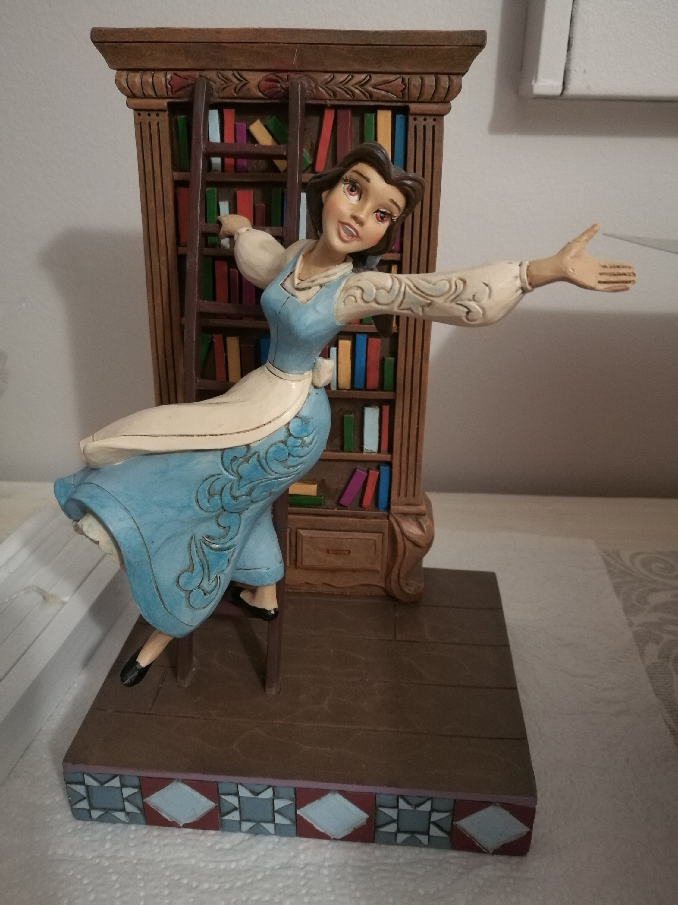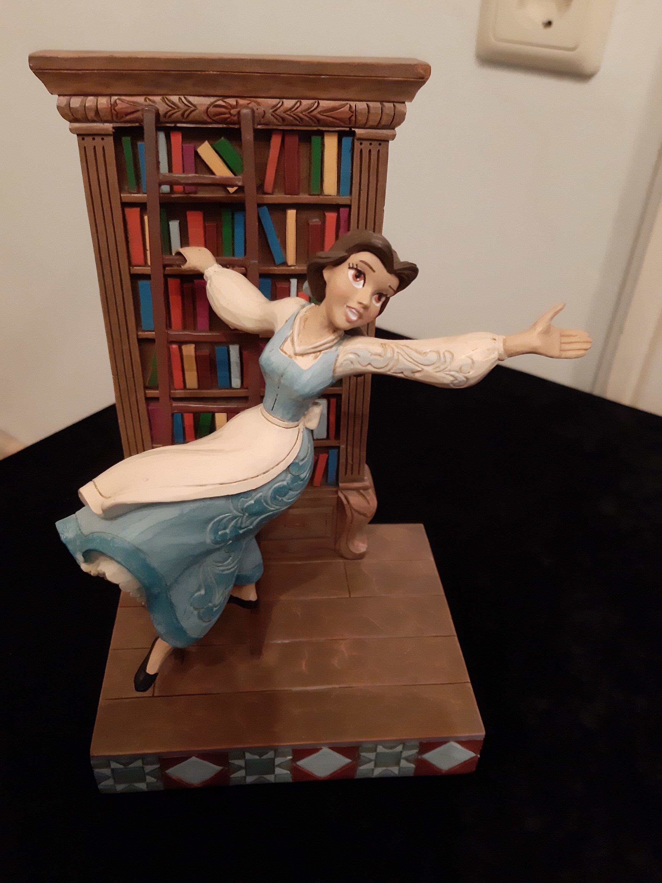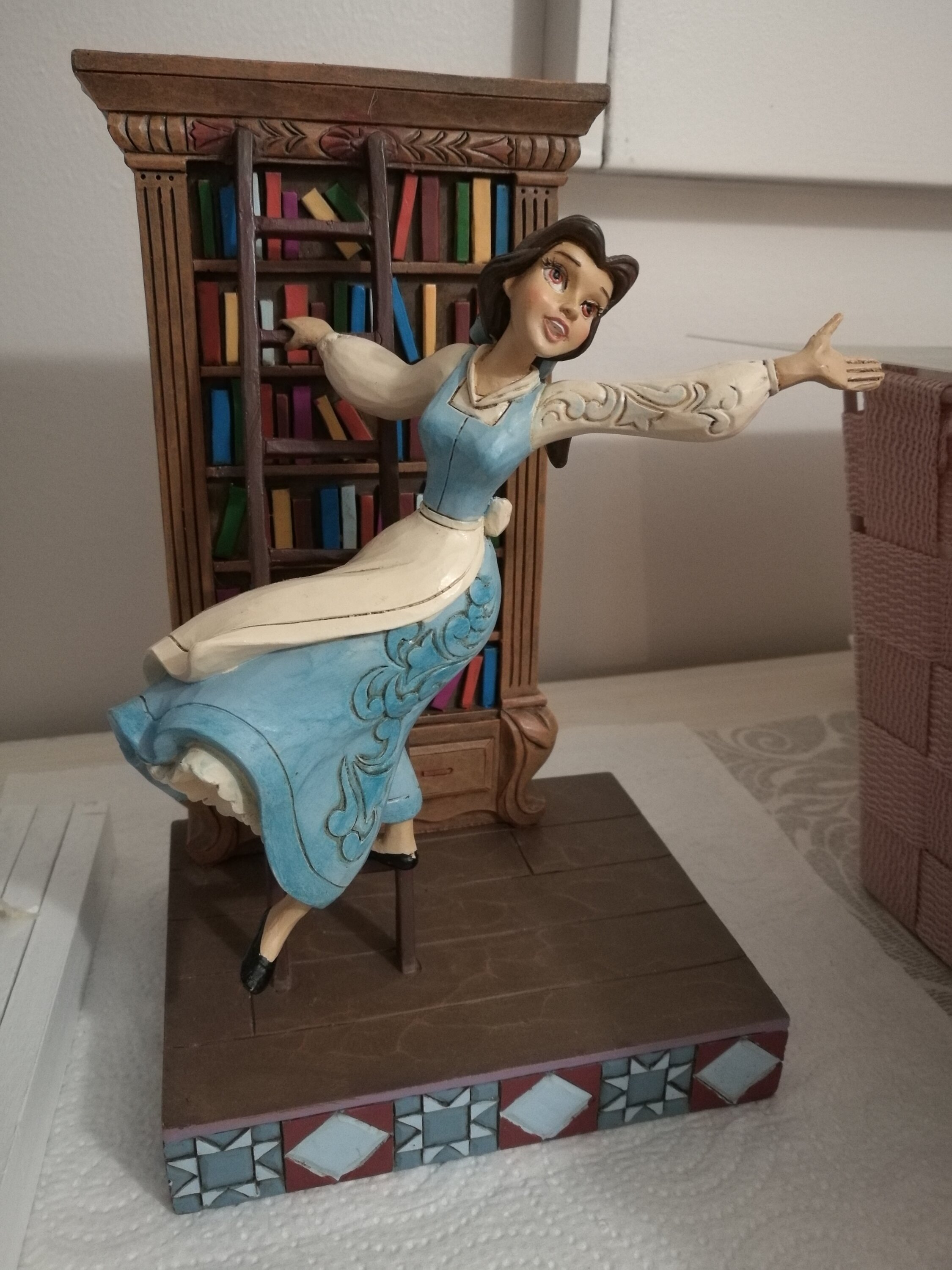 Superbe figurine très bien faite avec une taille généreuse,cerise sur le gâteau:sa robe est bleue (très rare dans cette tenue). La scène est réaliste et retrace celle du dessin animé dans laquelle Belle se penche sur la bibliothèque pour y choisir des livres;son bras penché lui donne vraiment le côté réaliste. Je la recommande vivement pour les fans.