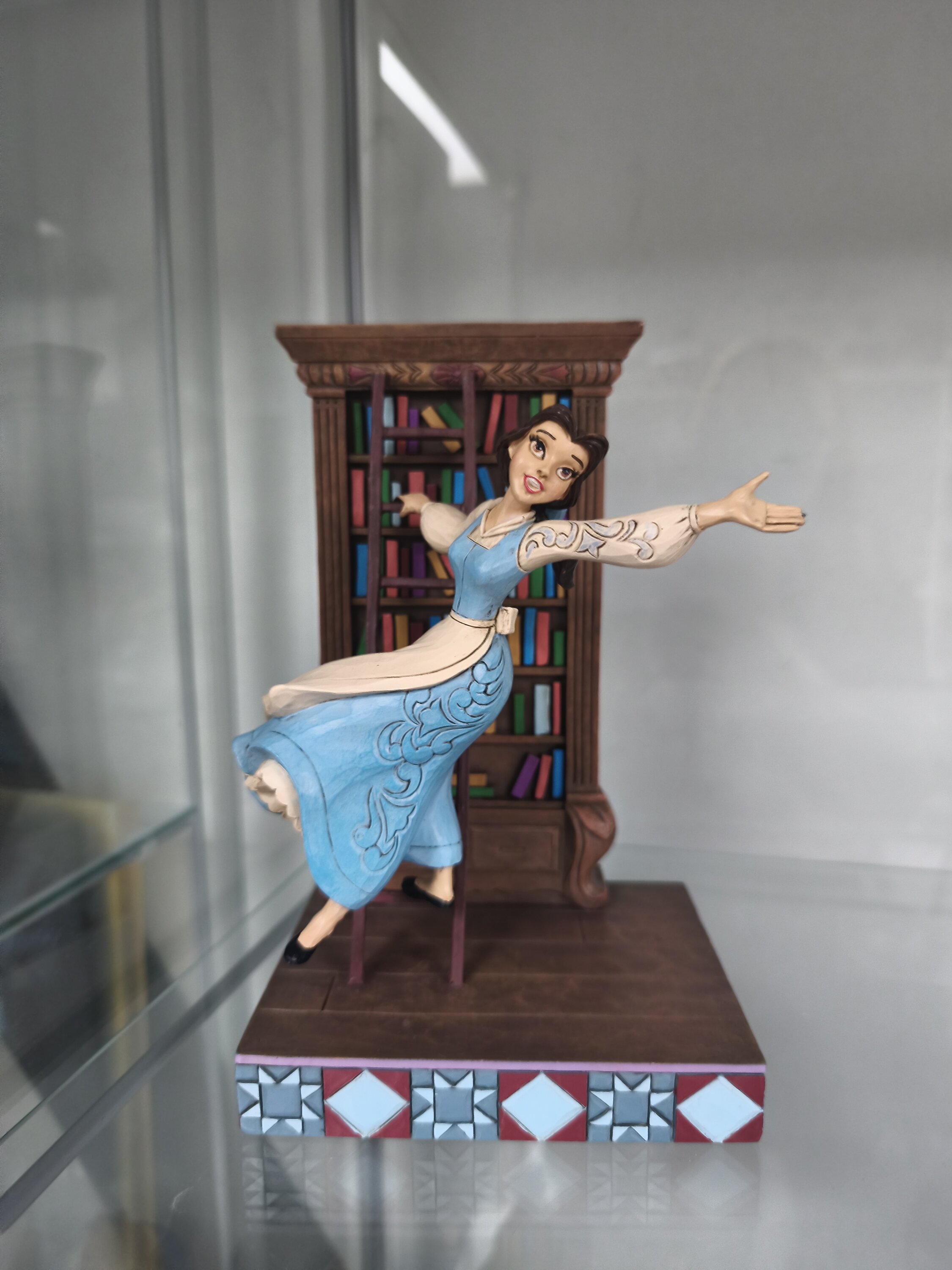 Superba statuetta di ottima fattura e dalle dimensioni generose, ciliegina sulla torta: il suo abito è blu (molto raro in questo outfit). La scena è realistica e ricalca quella del cartone animato in cui Belle si china sulla biblioteca per scegliere i libri; il braccio appoggiato le conferisce davvero un tocco realistico. La consiglio vivamente agli appassionati.