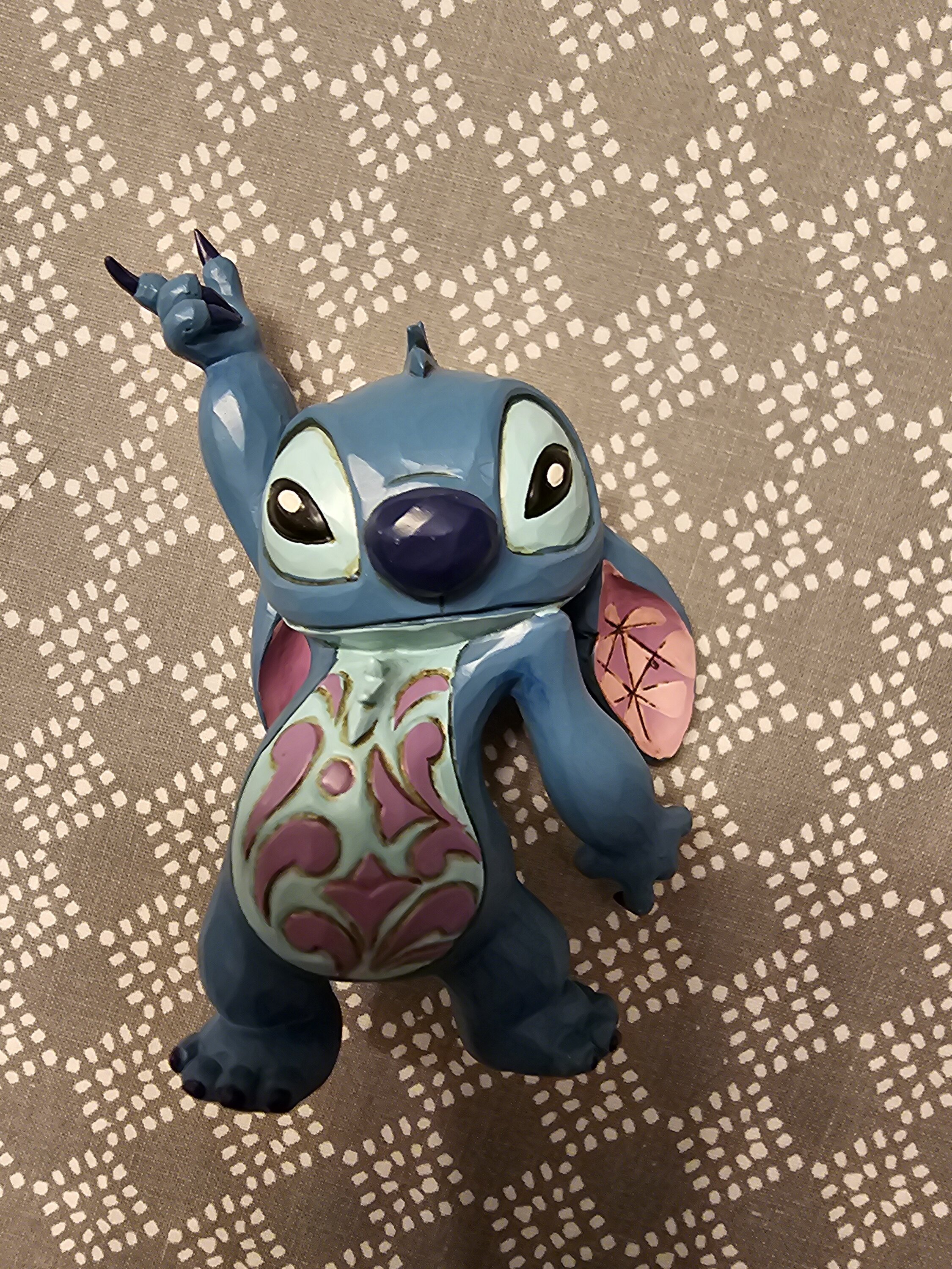 Questo vivace design Jim Shore cattura lo spirito giocoso di Stitch mentre balla con rosemaling sulla pancia e orecchie decorate. Che si tratti di hula o di Elvis, i suoi movimenti spensierati sono pieni di fascino e malizia.