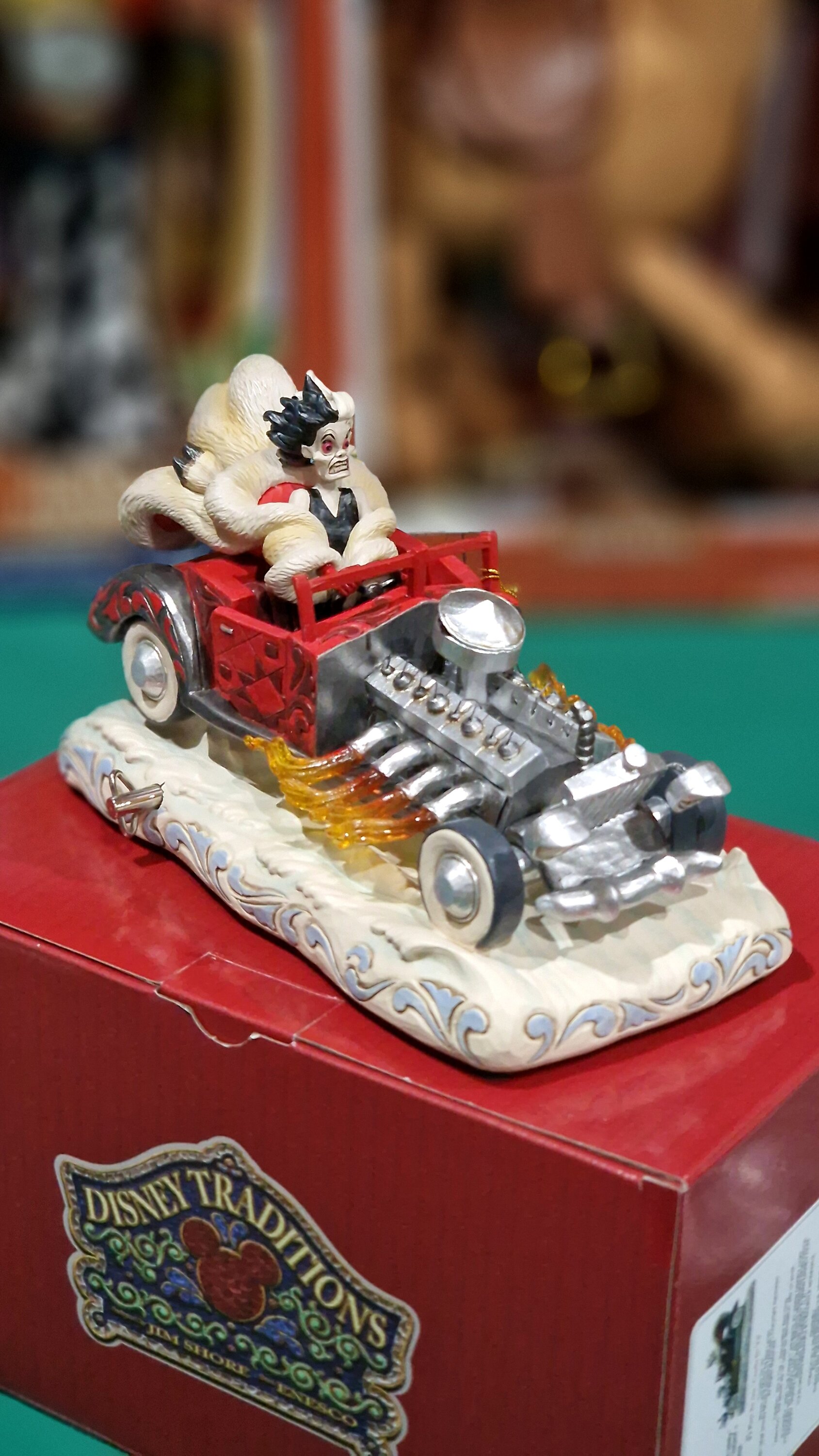Per celebrare il 65° anniversario de La Carica Dei 101, Jim Shore immortala Crudelia De Mon sfrecciare a bordo della sua auto rossa decorata con rosemaling e patchwork. Le fiamme esplodono dal motore mentre i suoi capelli selvaggi e la pelliccia svolazzano al ritmo della sua melodia distintiva.