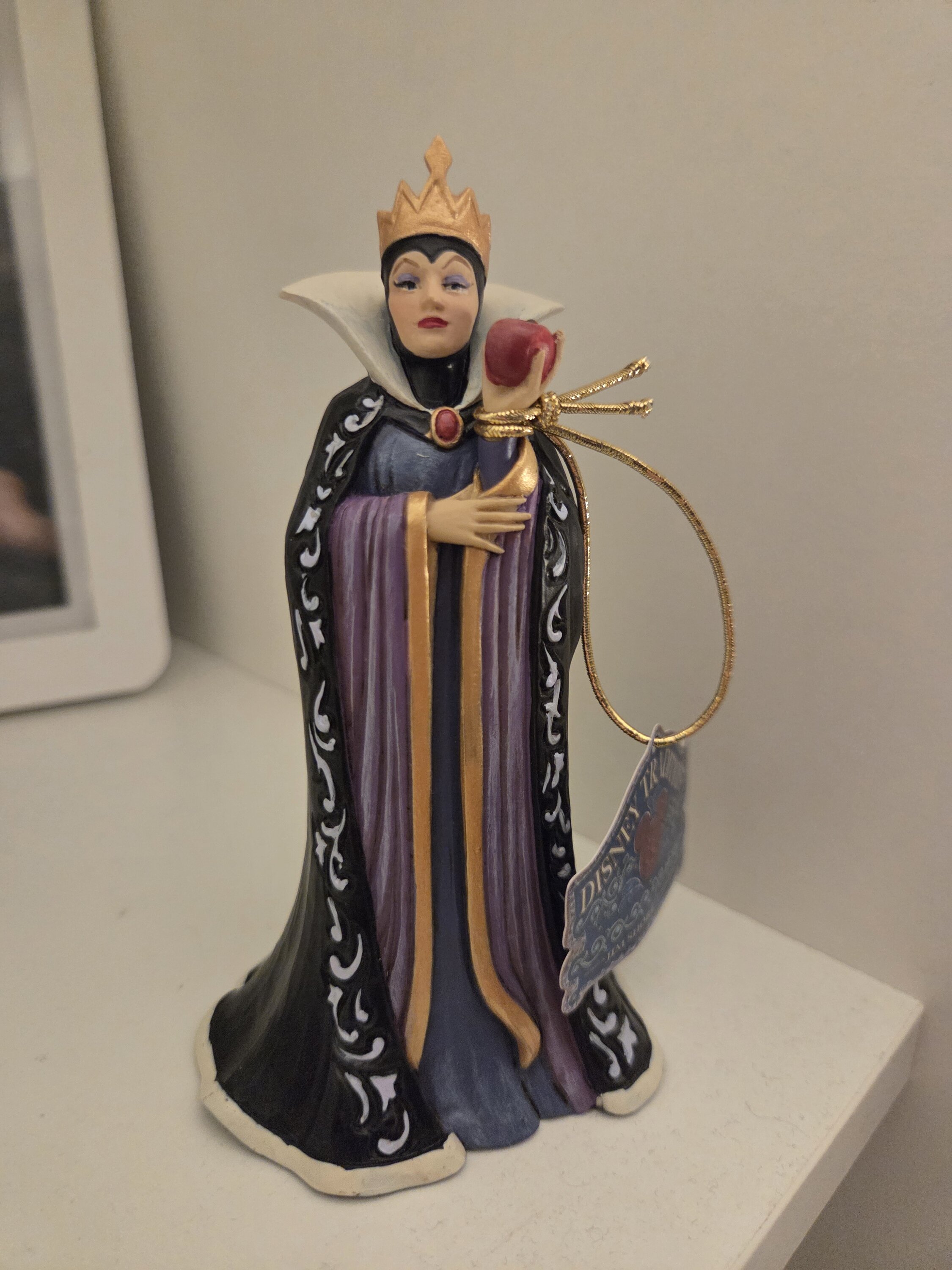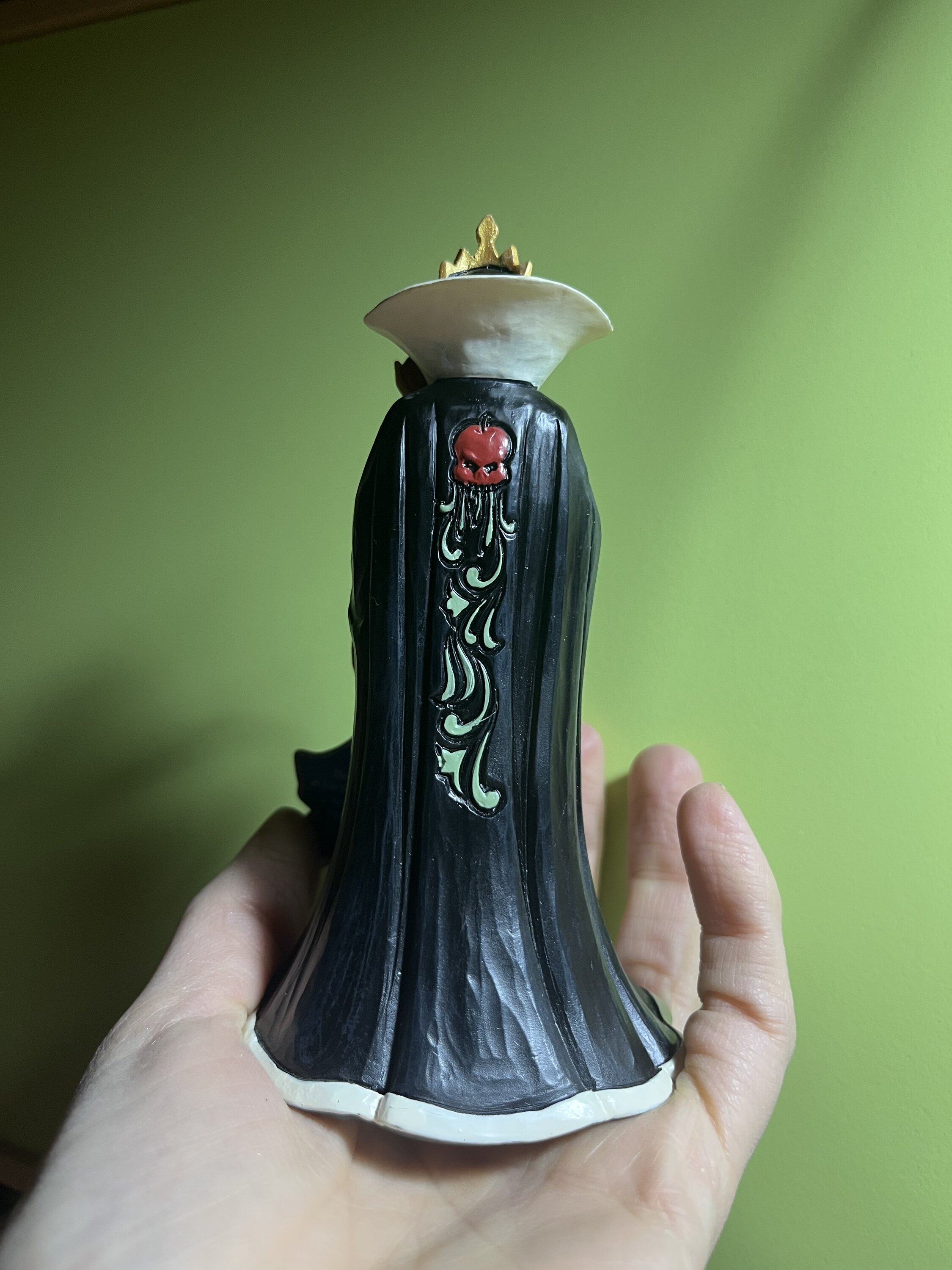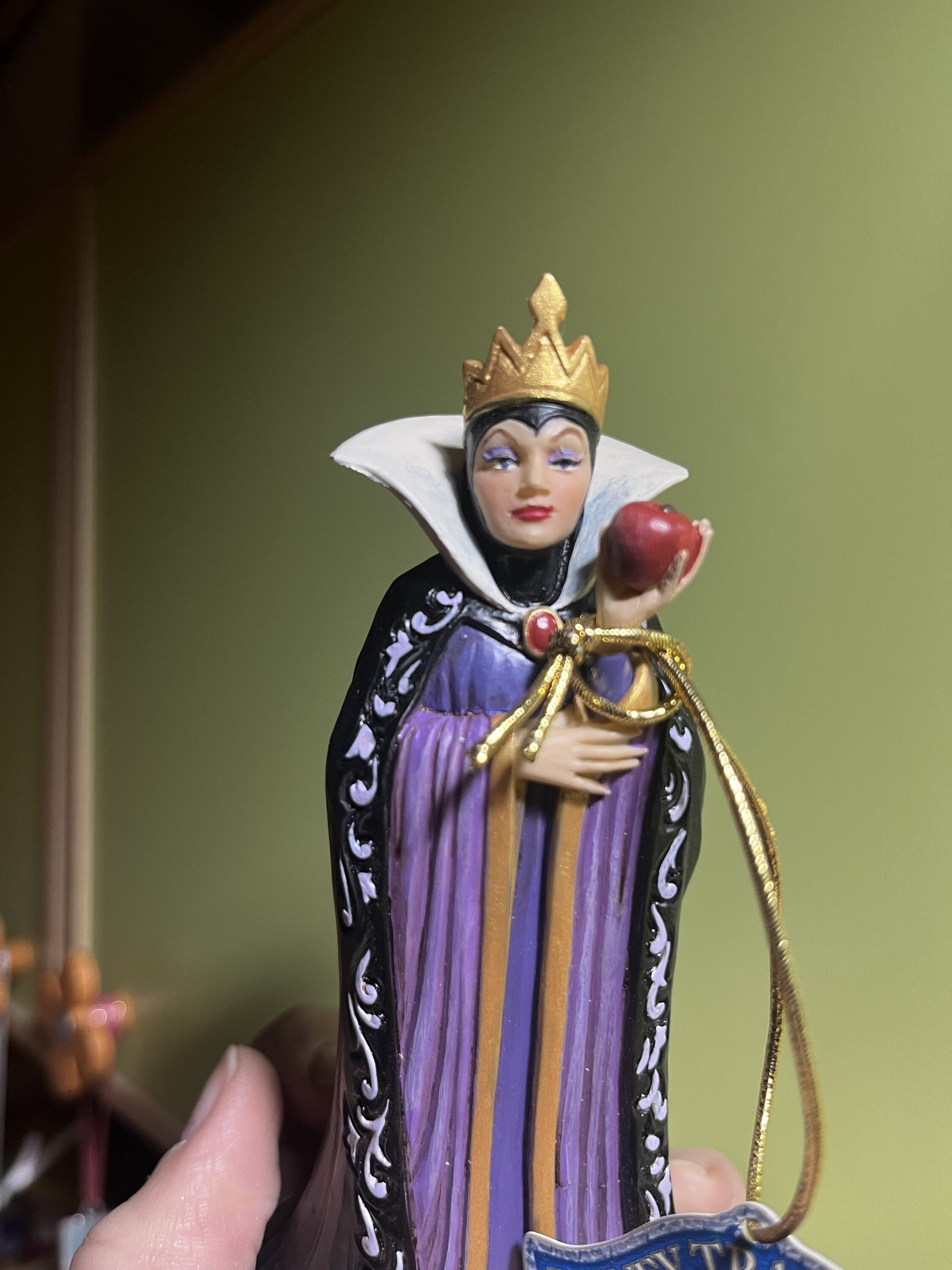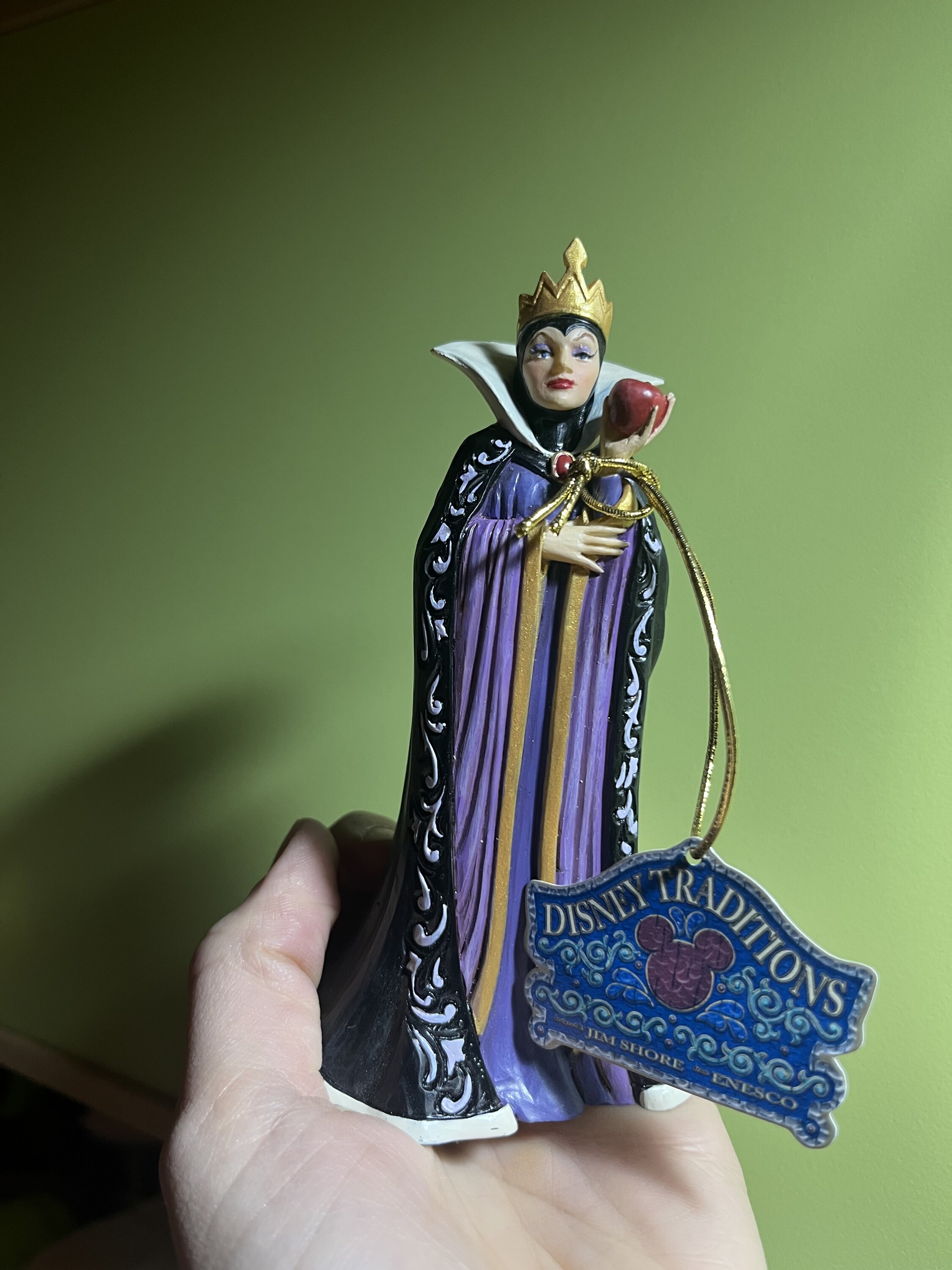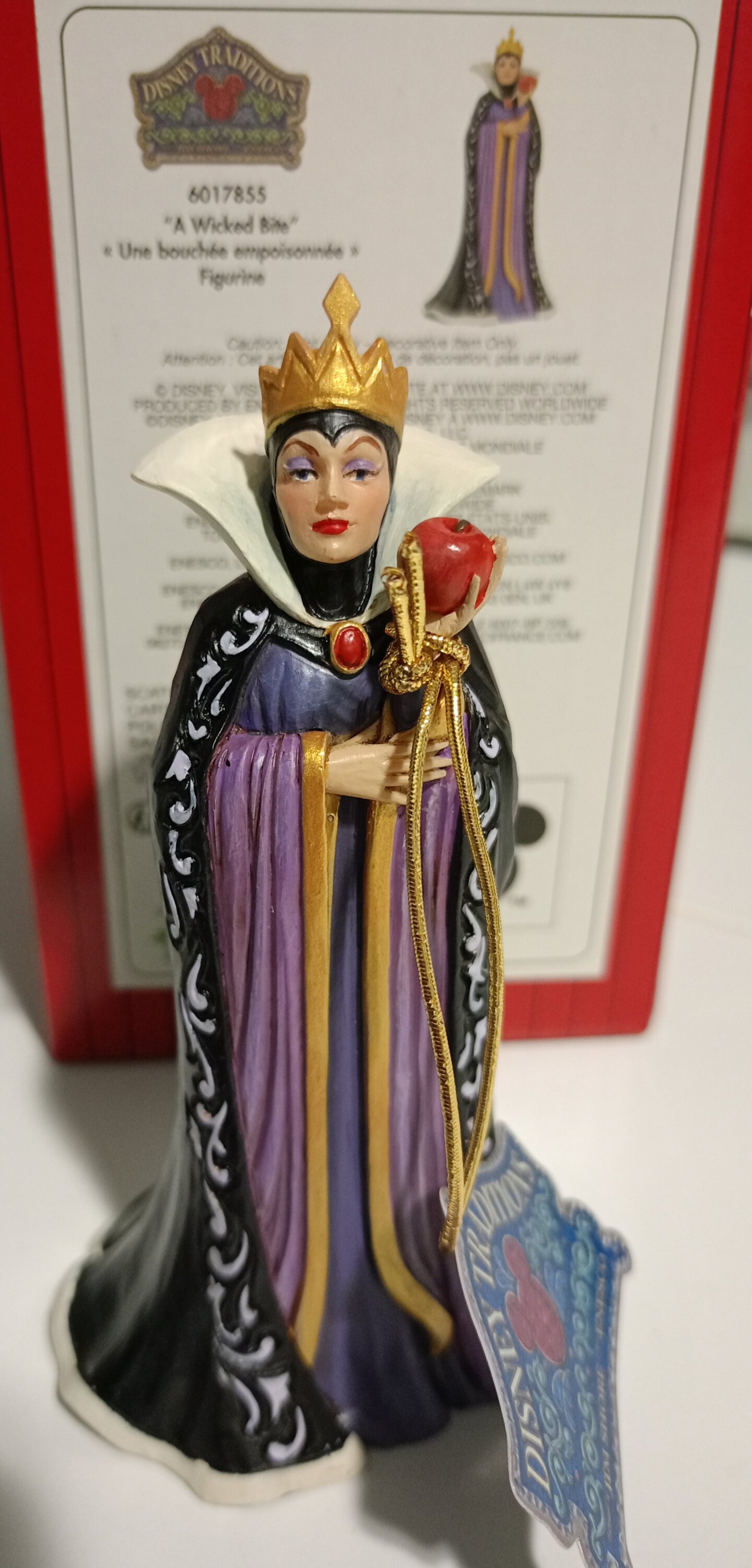 La Regina, Grimilde, indossa uno splendido abito nero e viola decorato con i motivi rosemaling e quilt tipici di Jim Shore. Con in mano una mela avvelenata destinata a Biancaneve, il suo cuore geloso alimenta le sue oscure intenzioni mentre trama la sua prossima mossa.