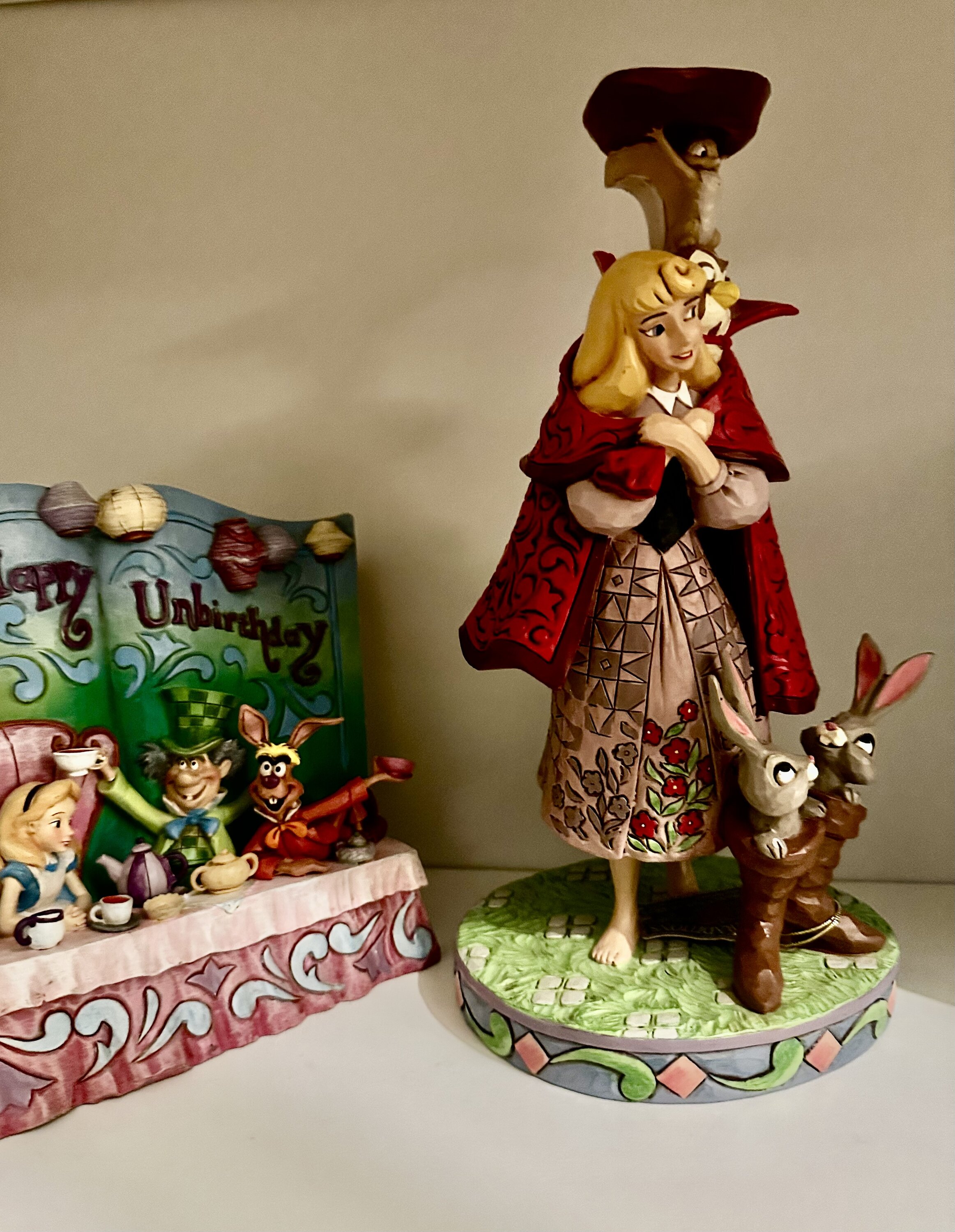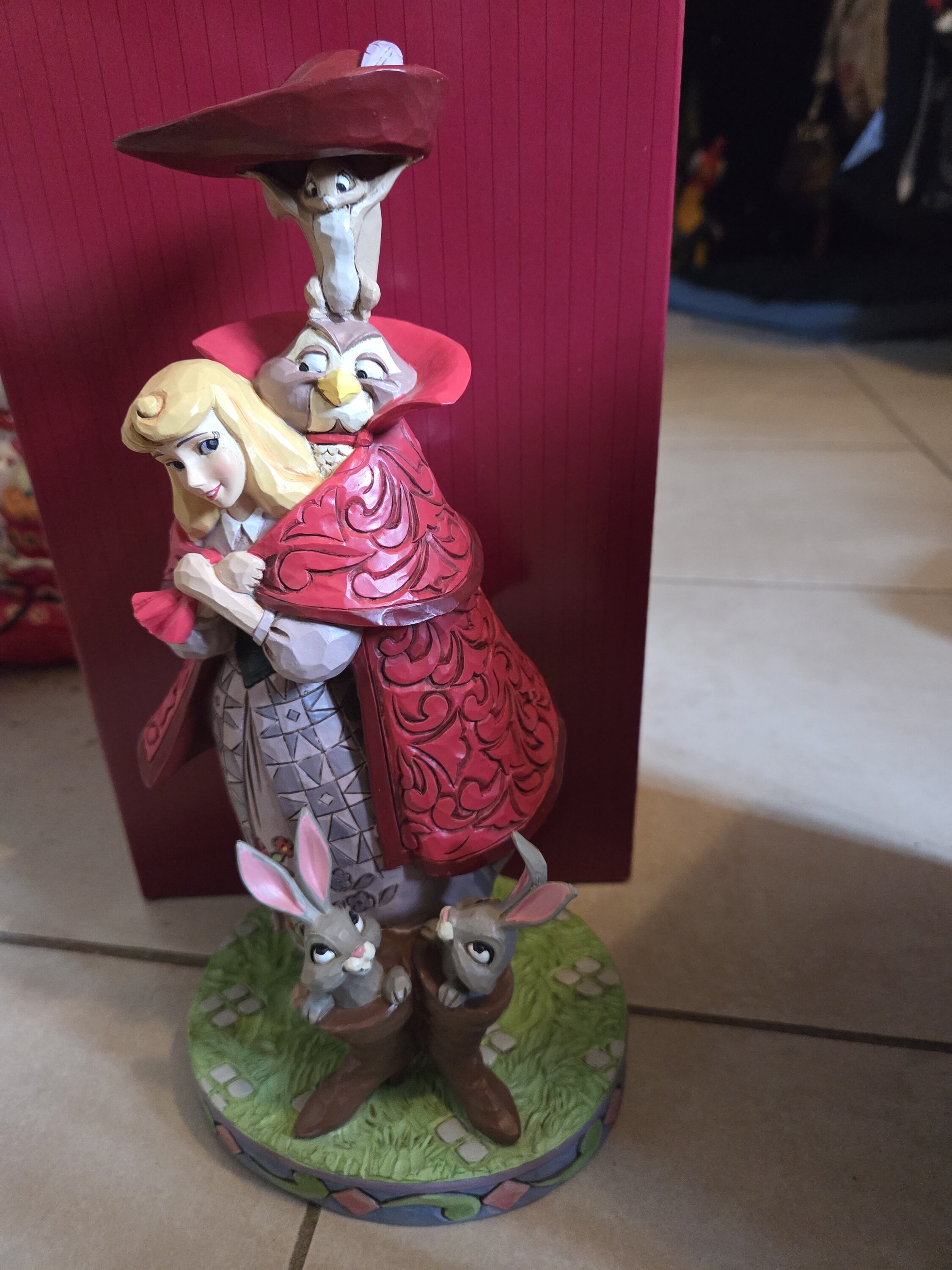 Gli amici della foresta di Aurora si trasformano in un uomo con un cappotto rosso mentre lei cerca il suo principe. Un gufo, uno scoiattolo e dei coniglietti dentro gli stivali aggiungono fascino a questo accattivante design Jim Shore , dando vita alla memorabile scena del film con incanto.