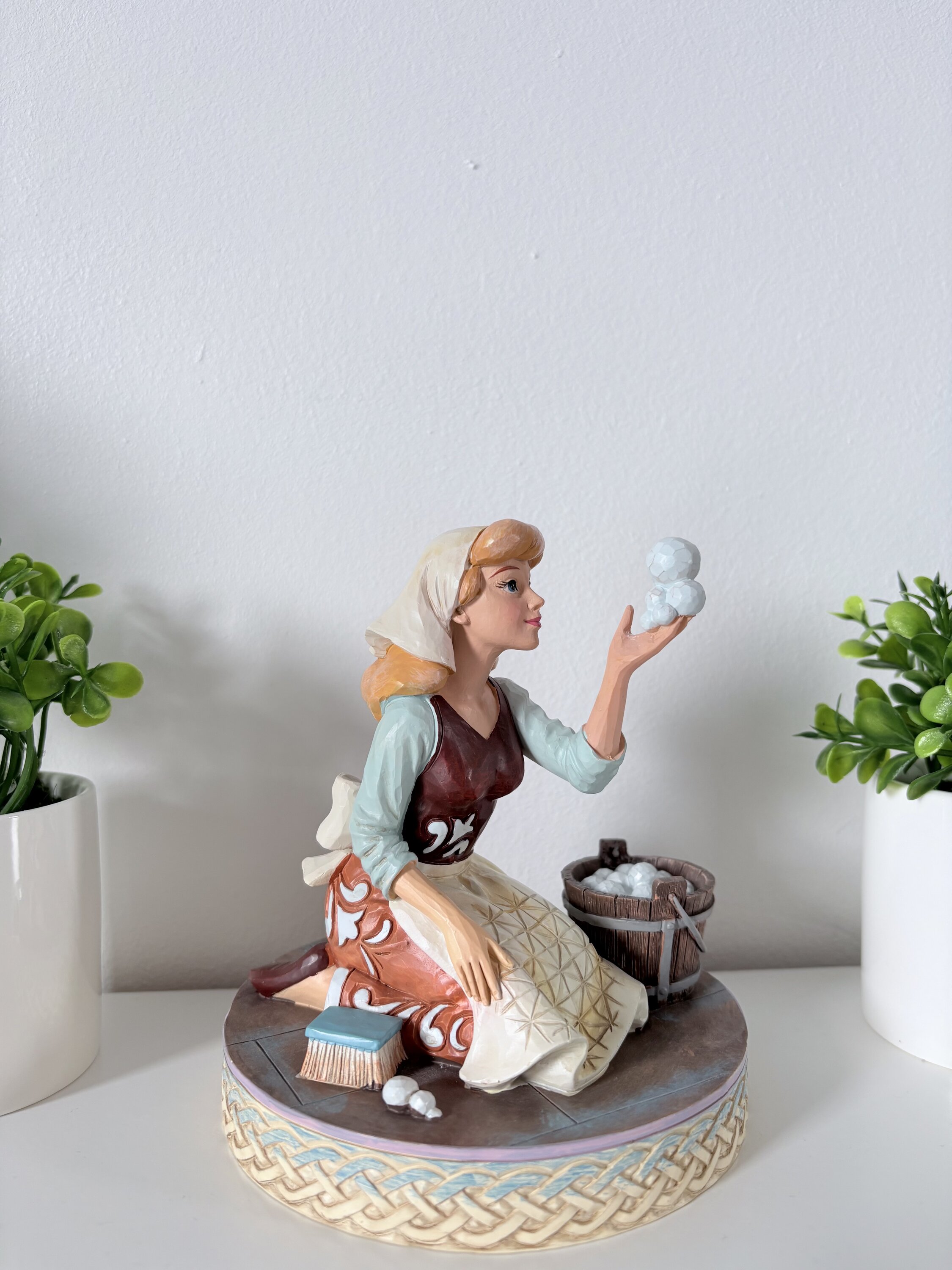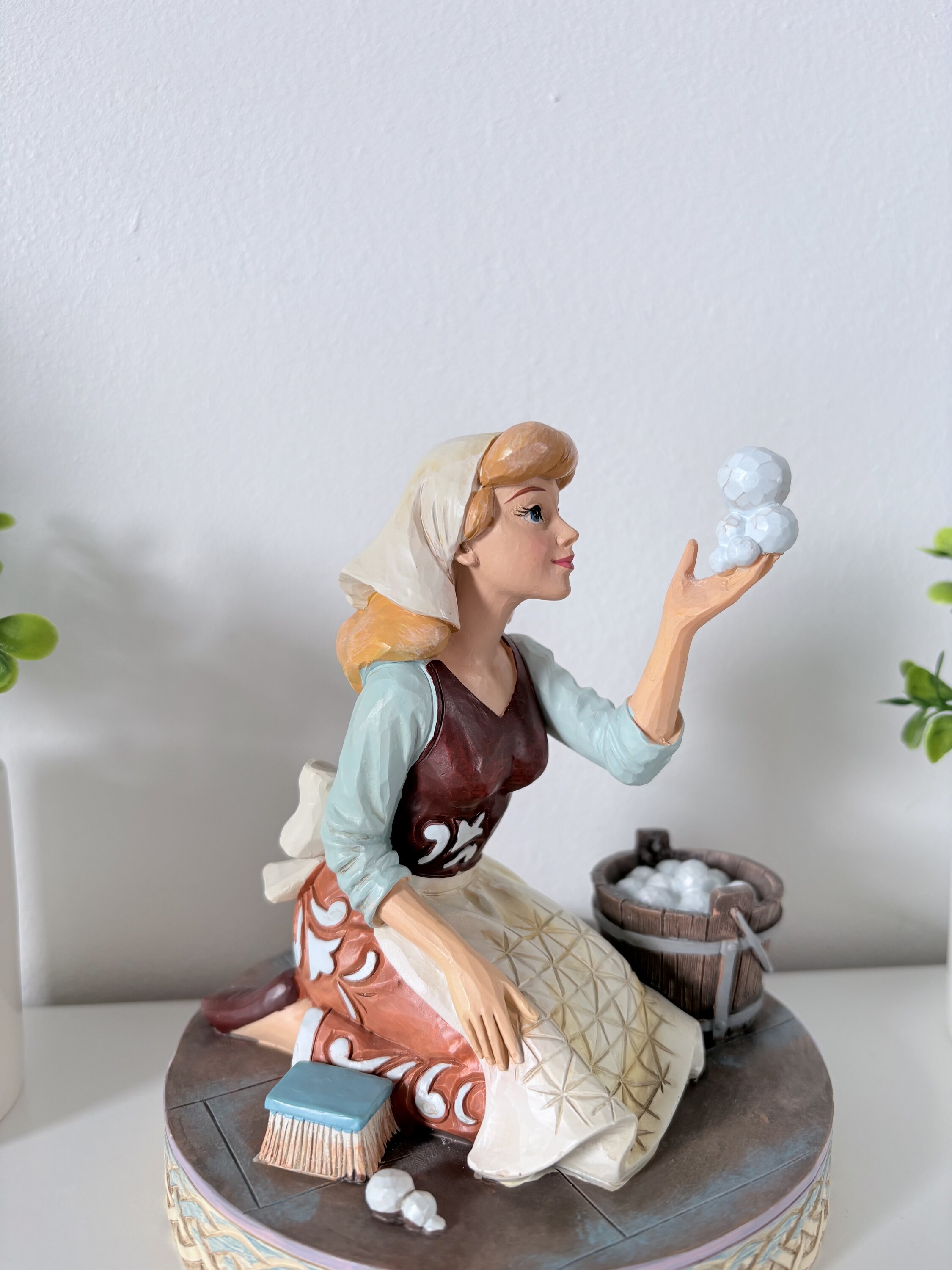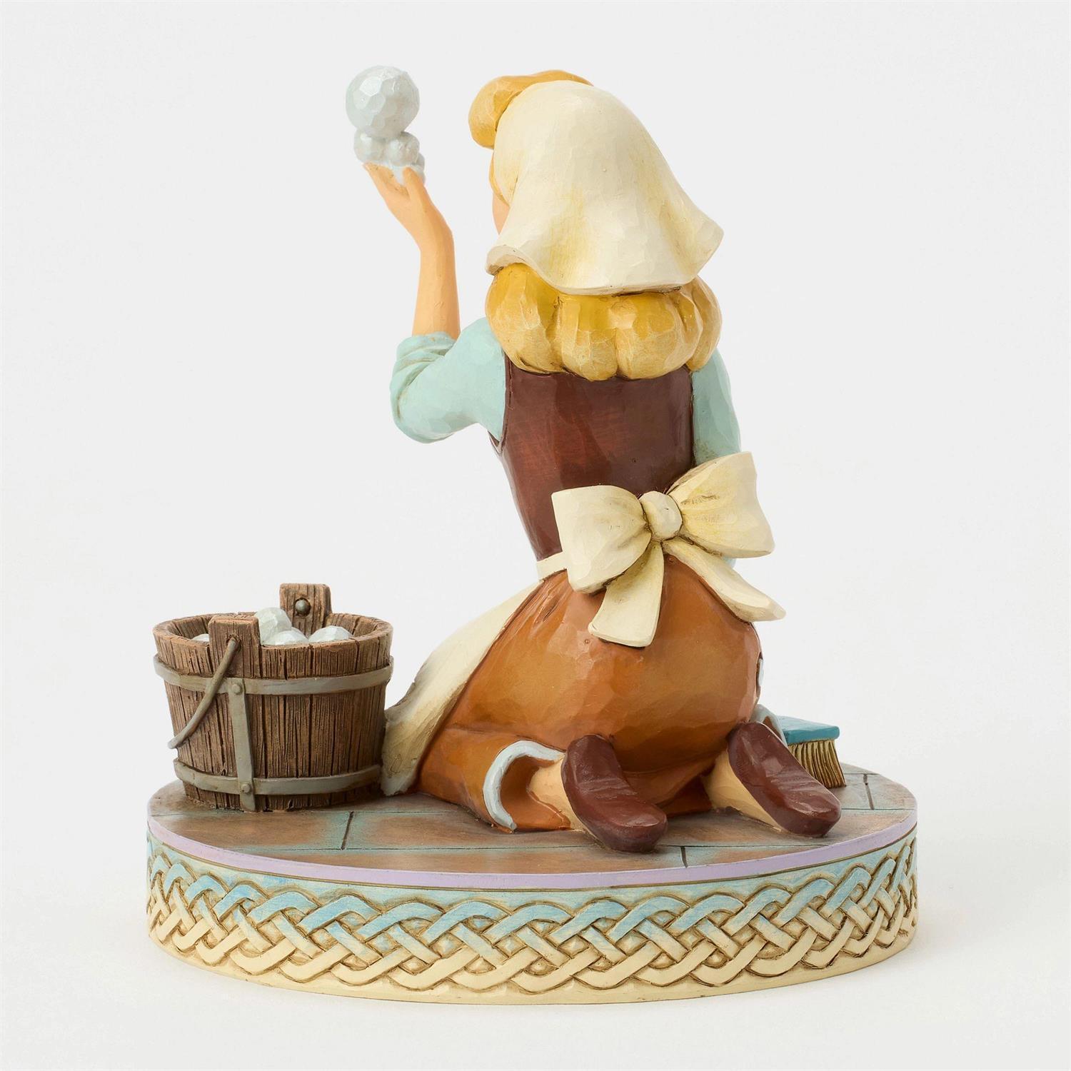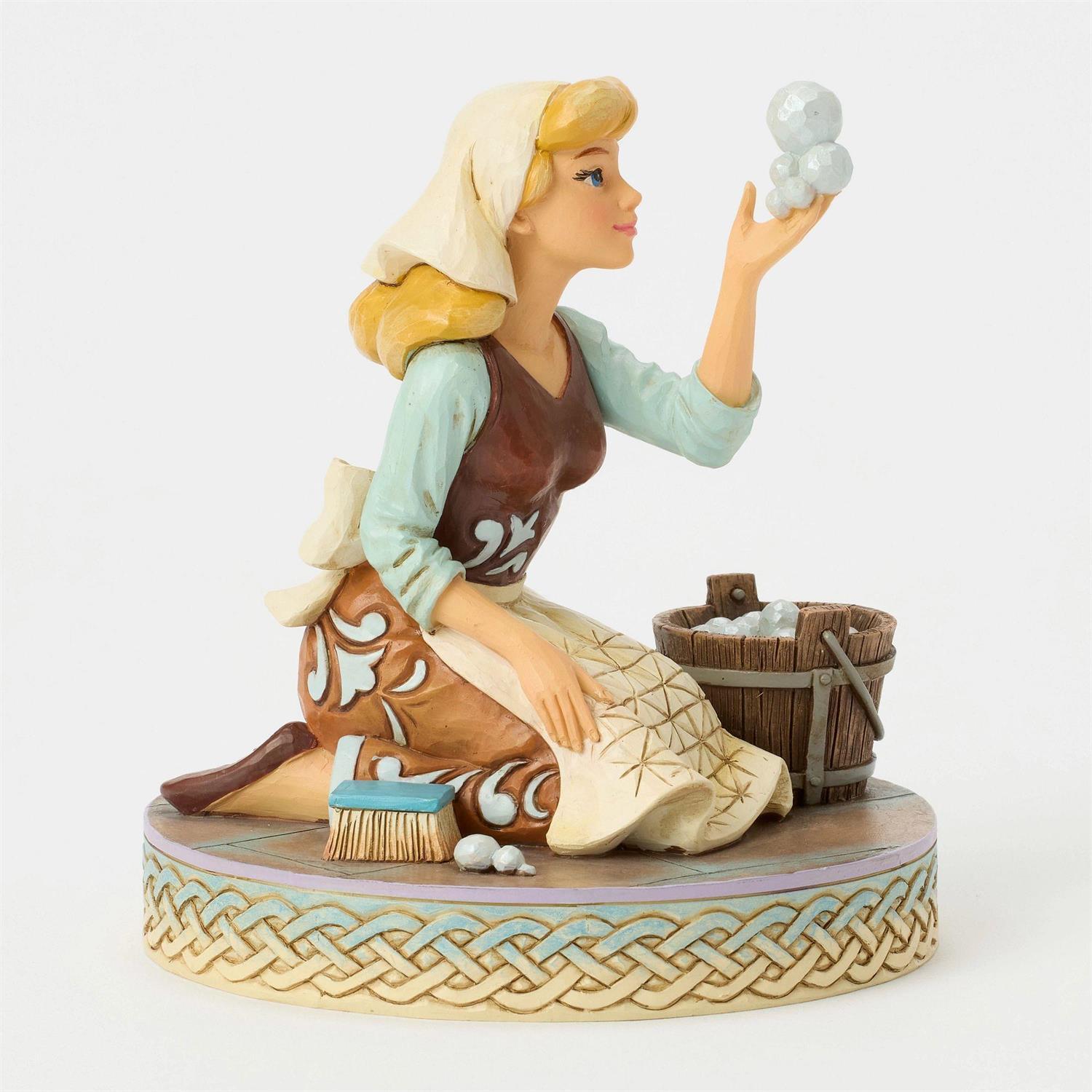 Lo spirito di Cenerentola rimane intatto in questa suggestiva scena Jim Shore . Vestita da cameriera, trova gioia nel suo lavoro, catturando una bolla mentre lava i pavimenti. Gli incantevoli dettagli di Jim Shore catturano la sua bellezza e la sua resilienza.