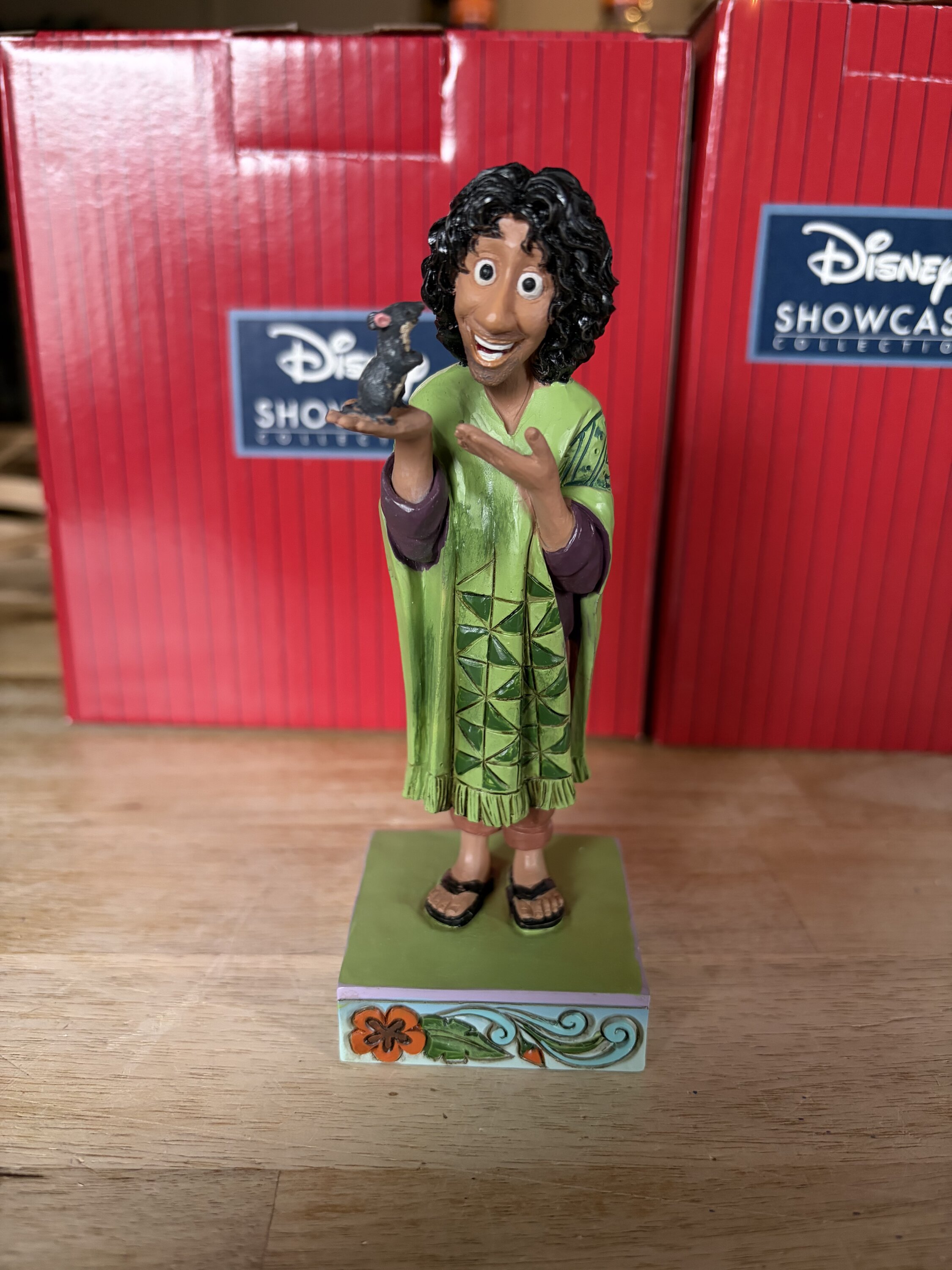 Jim Shore dona un lato più tenero a Bruno, lo zio incompreso di Encanto, in questa toccante creazione. Catturando Bruno con un topo, motivi ispirati all'arte popolare e colori accattivanti, questo personaggio estraniato acquisisce fascino e tenerezza.