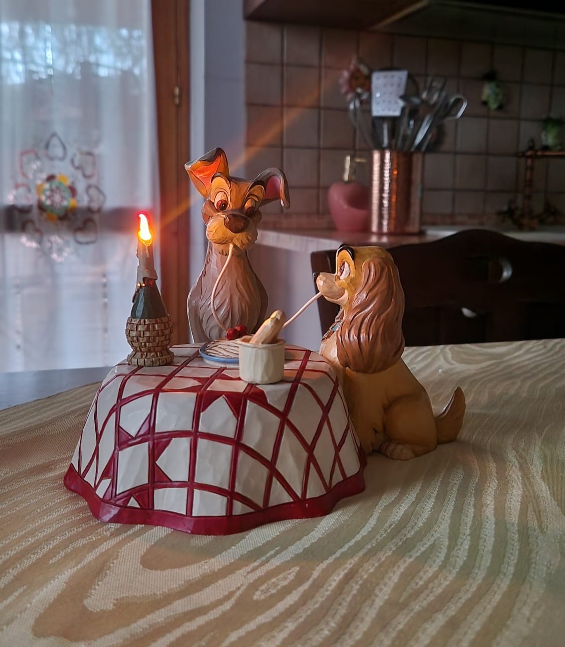 Una bellissima statuina raffigurante l'iconica scena del film Lilli e il Vagabondo al ristorante italiano ♥️. La adoriamo. 🥰