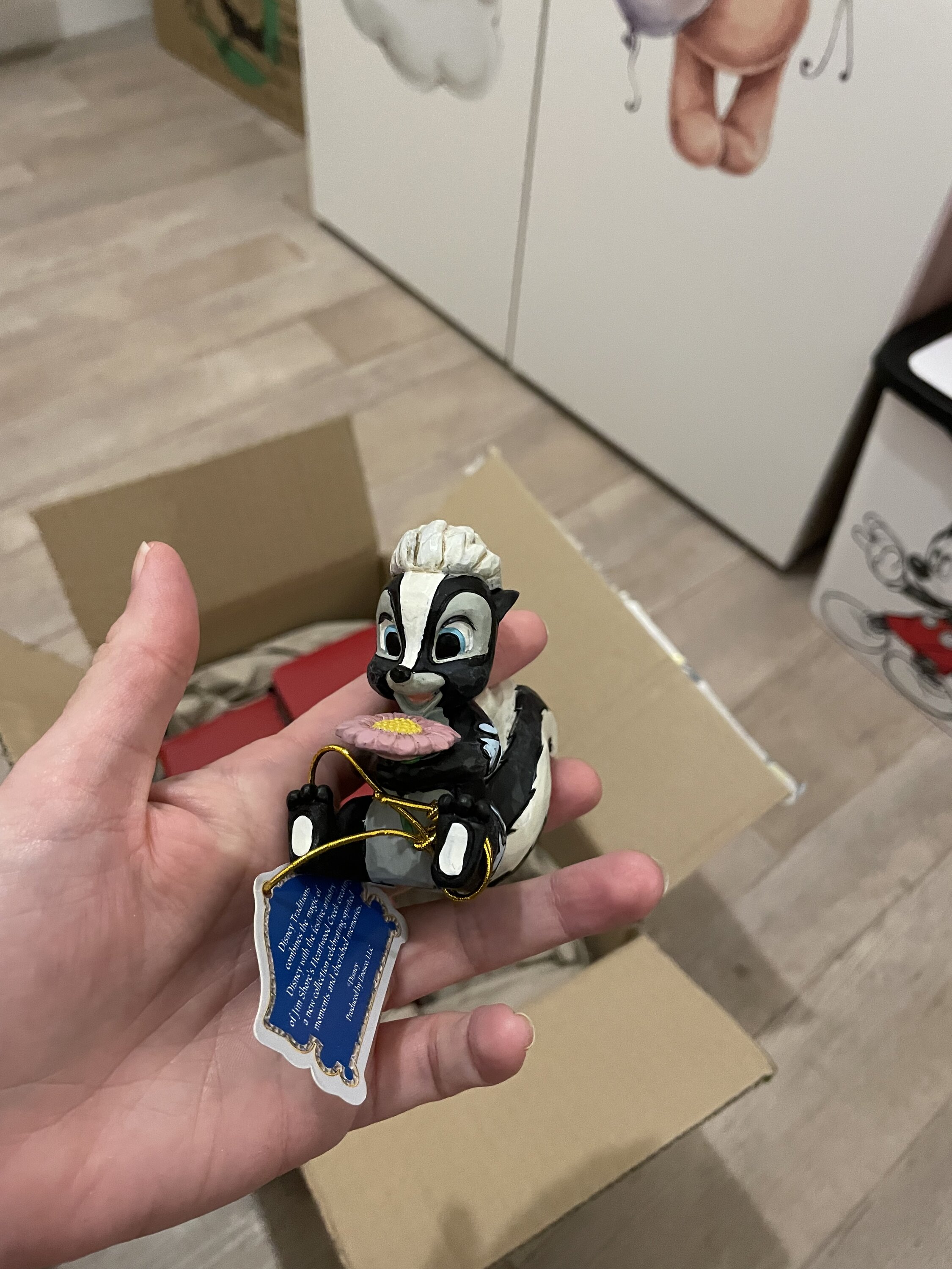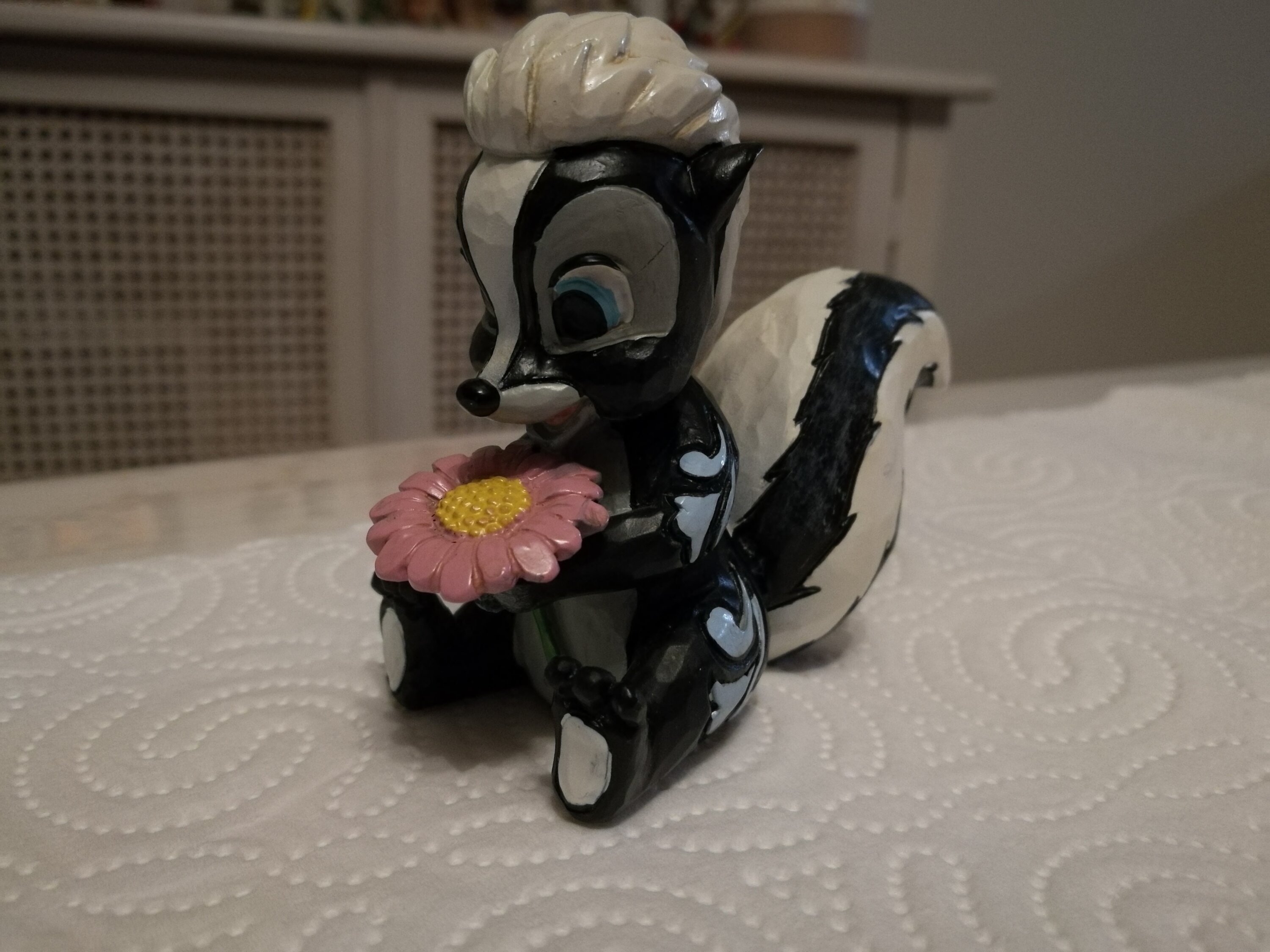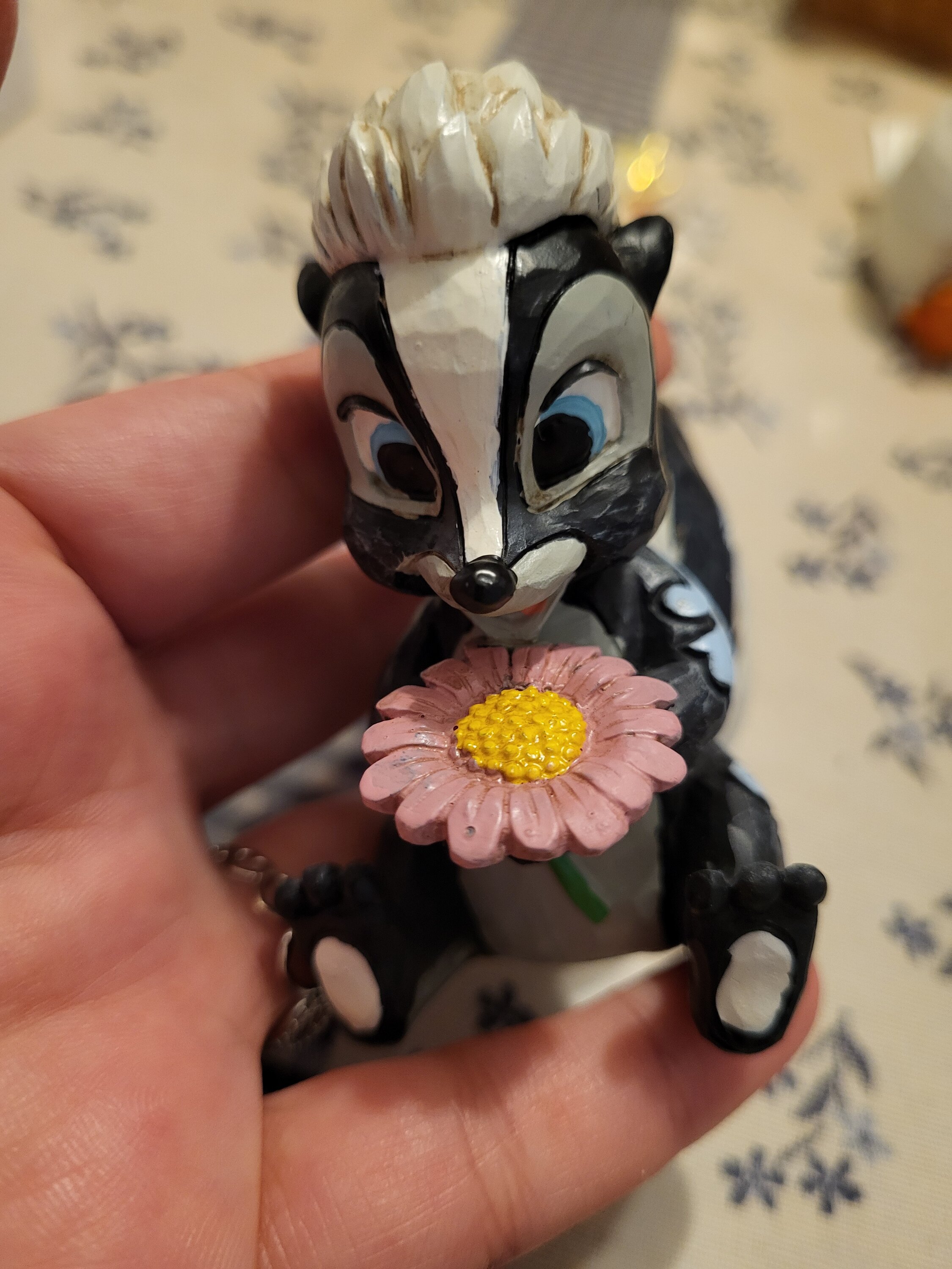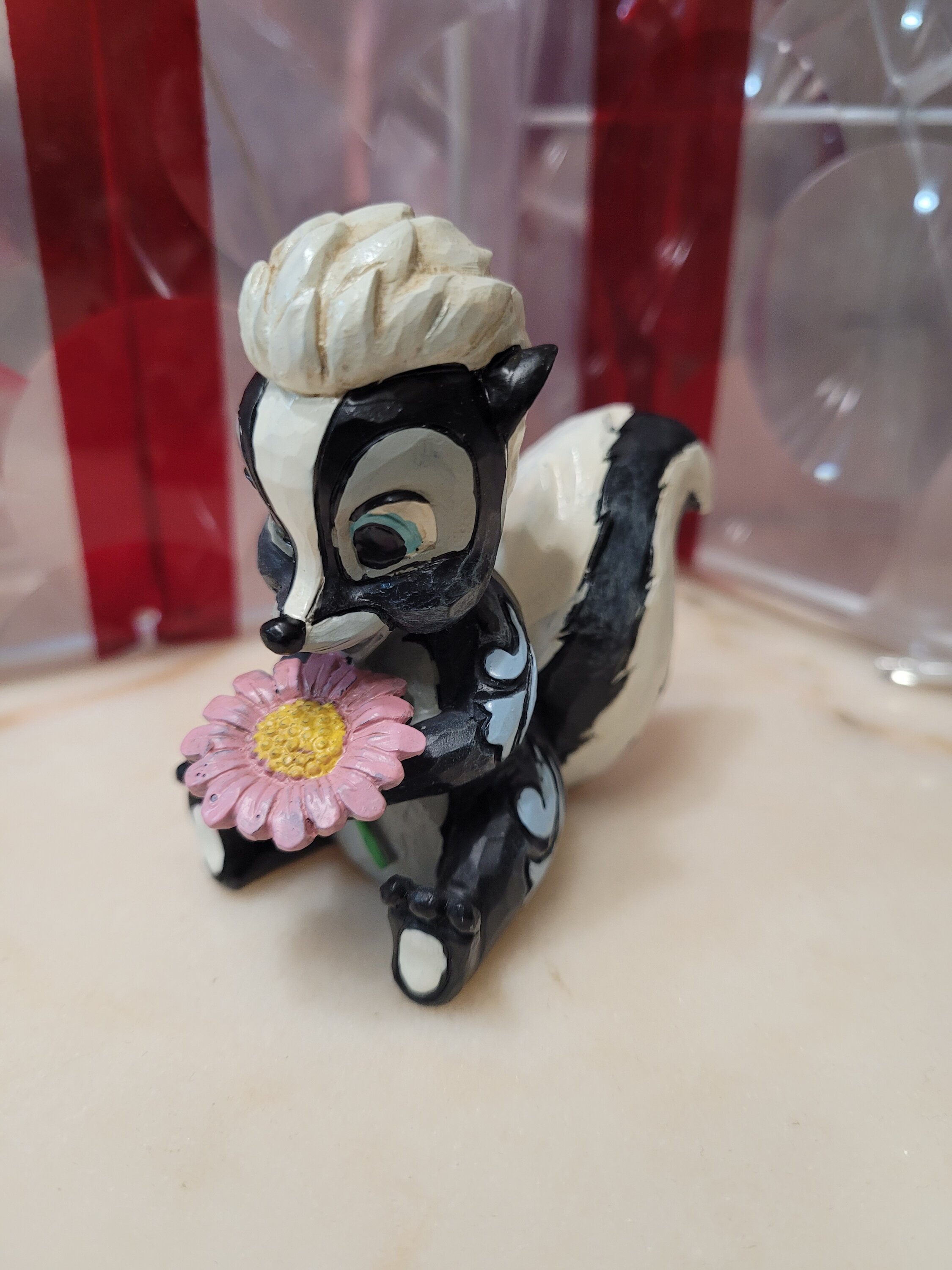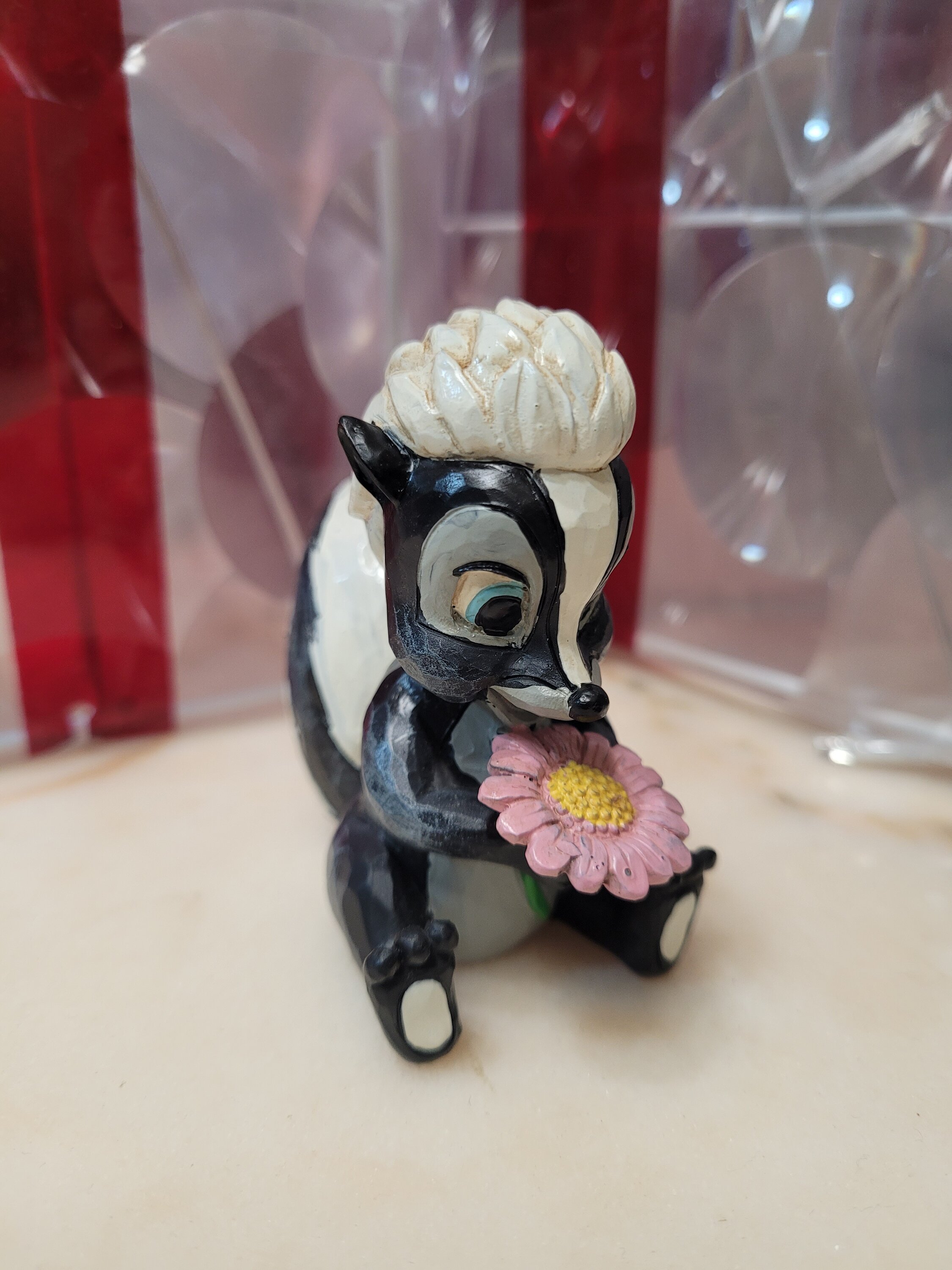 Questa adorabile miniatura Jim Shore raffigura Flower, la puzzola di Bambi, adornata con una splendida rosemaling e con una manciata di fiori freschi in mano. Con un sorriso luminoso e un amore infantile, irradia dolcezza e fascino.