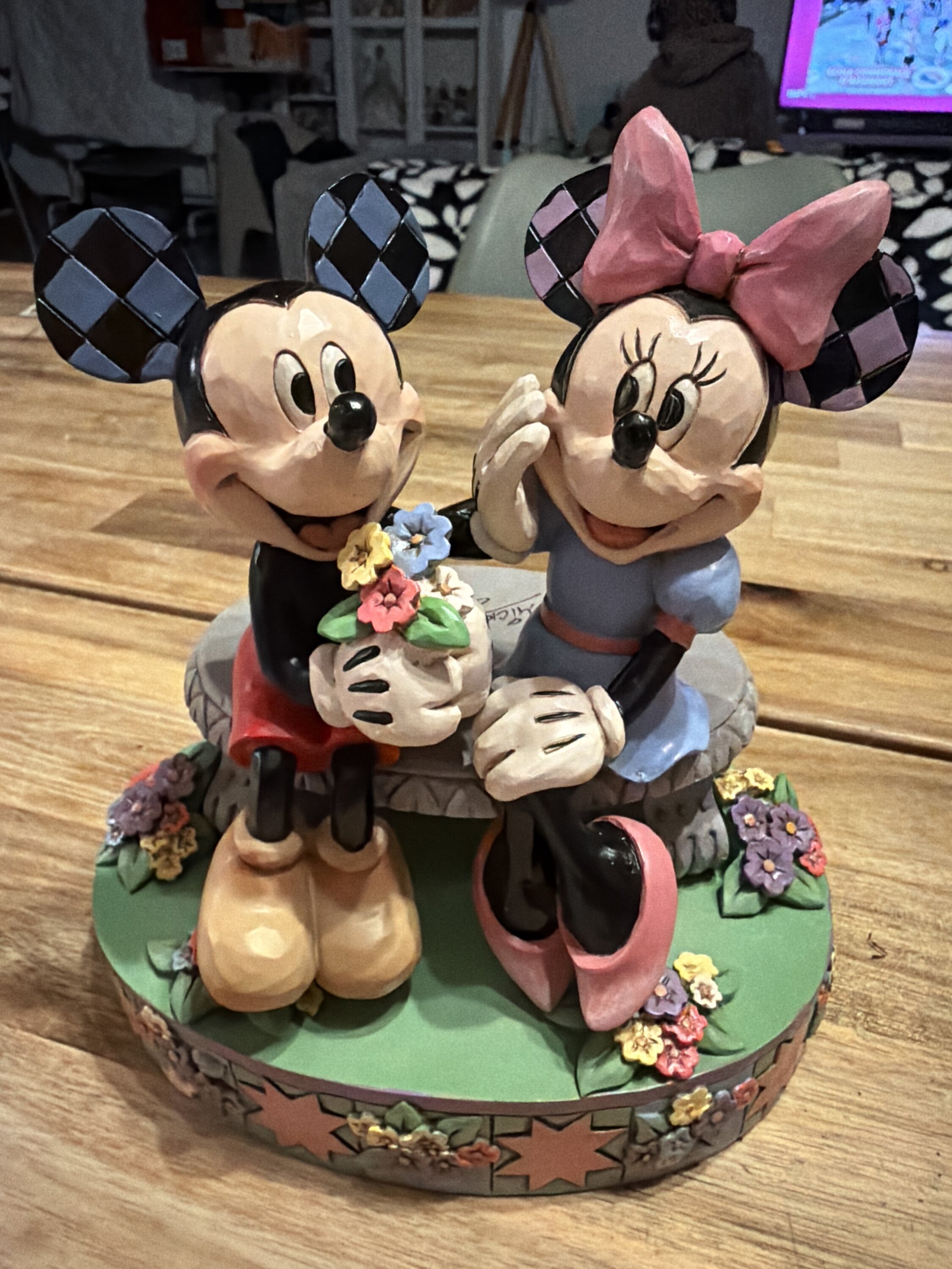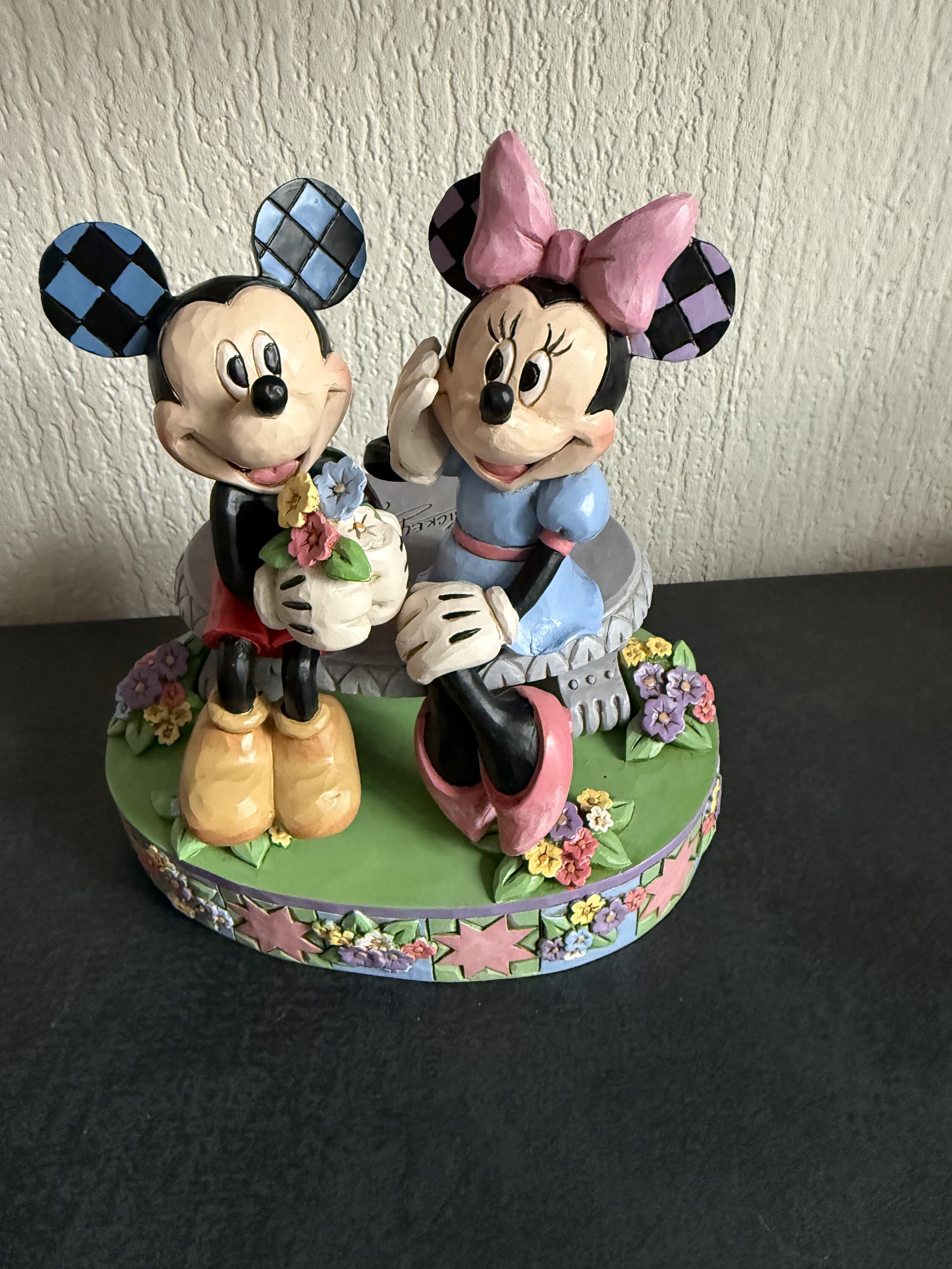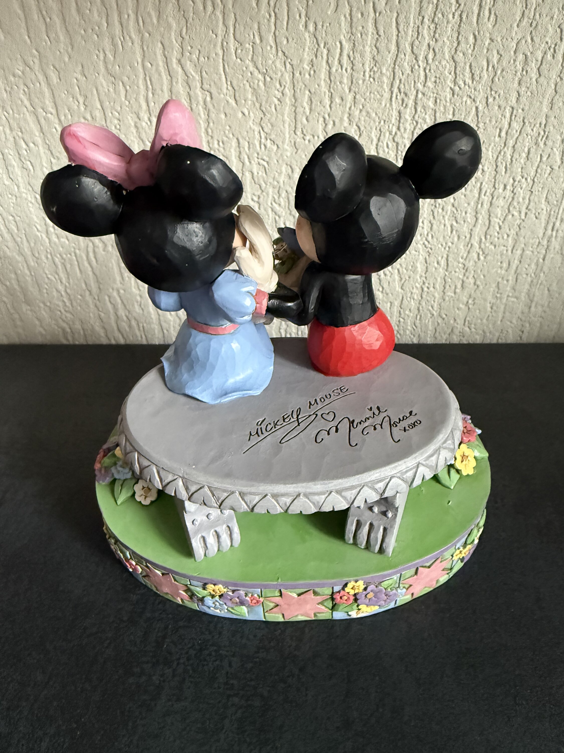 Topolino e Minnie condividono un dolce momento su una panchina del parco in questa romantica scena Jim Shore . Circondato da fiori colorati e dai motivi di rosemaling e quilt di Jim, Topolino offre a Minnie un fresco bouquet mentre arrossisce.