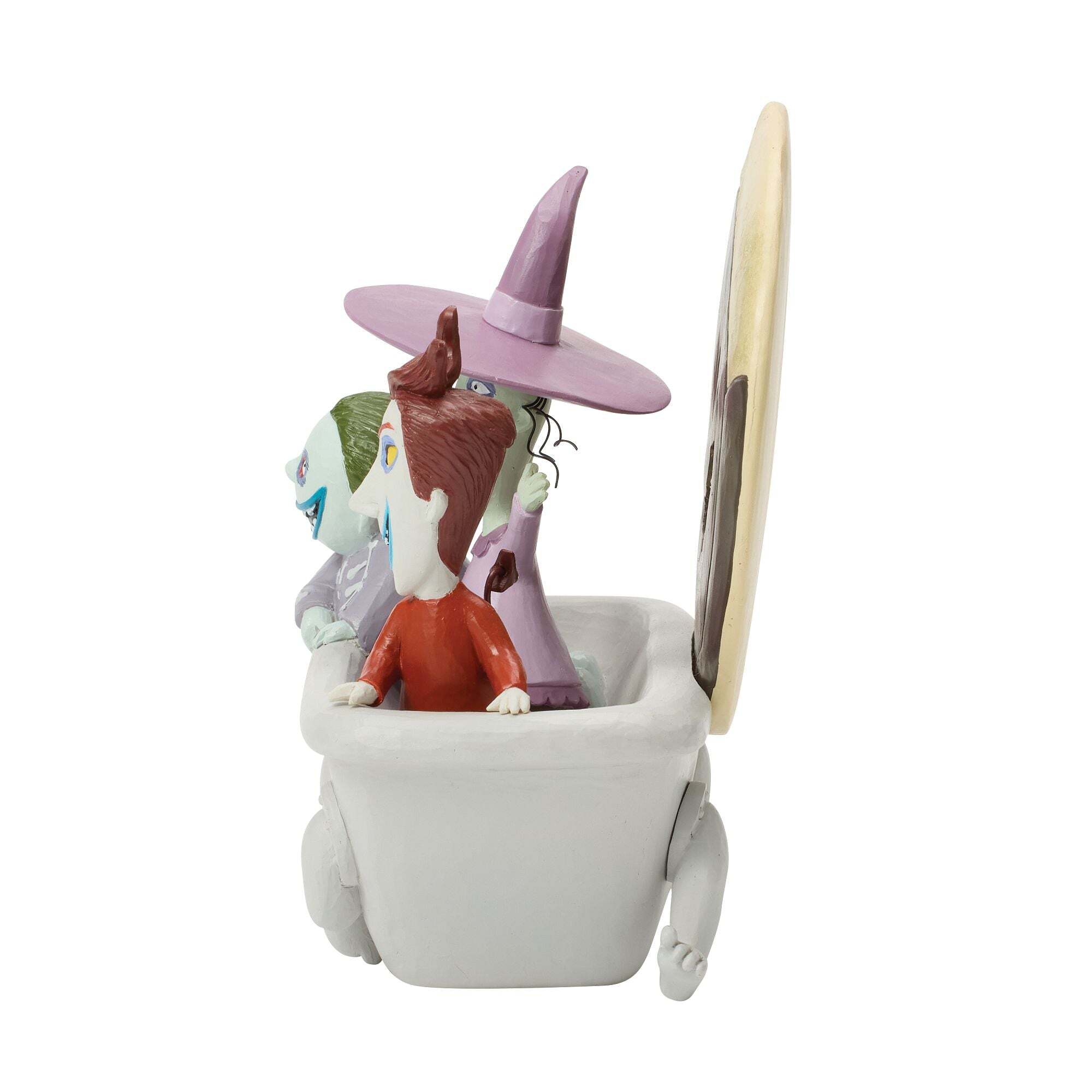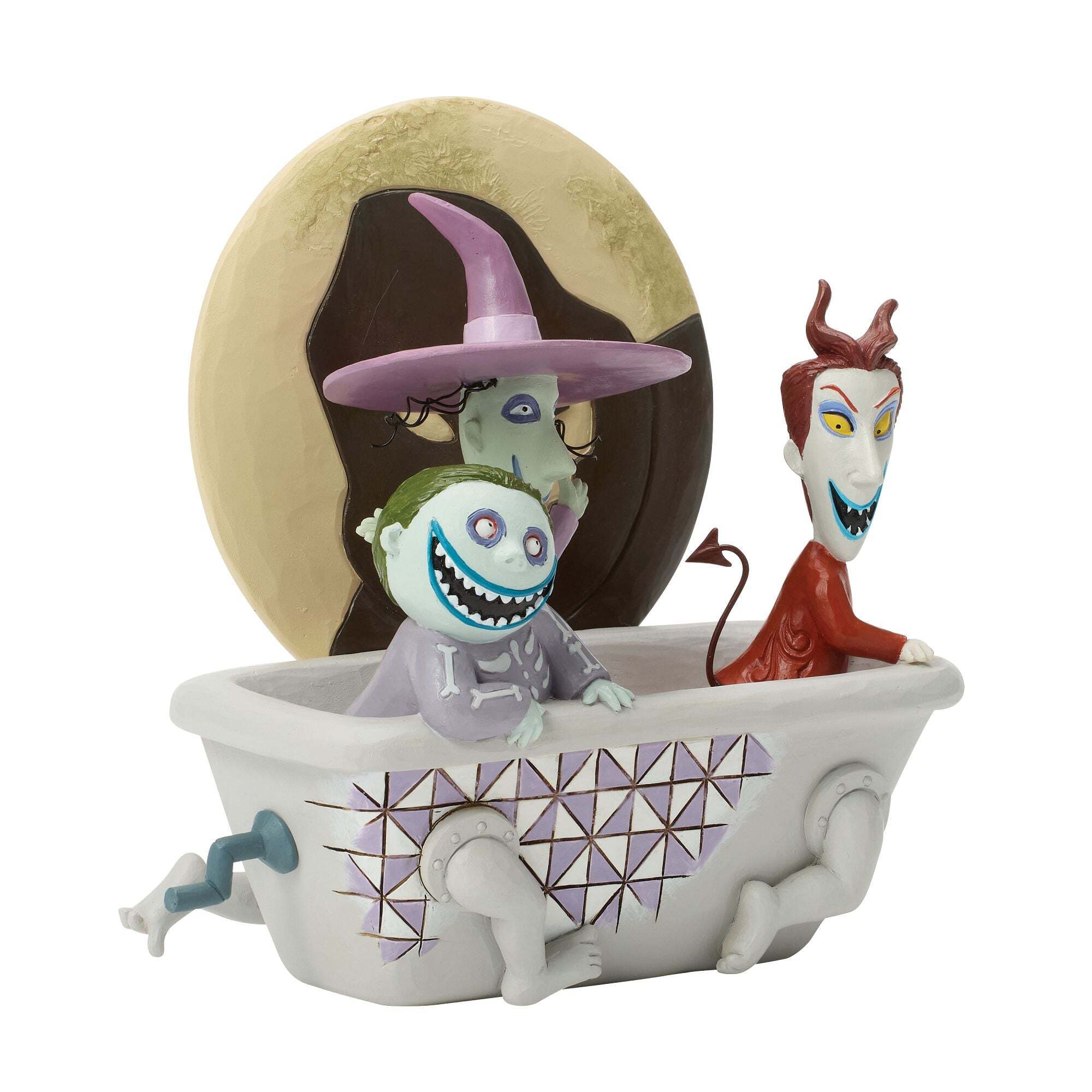 Macabri e birichini, Lock, Shock e Barrel si uniscono in questa giocosa scultura Disney Traditions ispirata a The Nightmare Before Christmas. Riuniti in una vasca da bagno sotto una luna luminosa, le espressioni esagerate e le pose bizzarre del trio catturano perfettamente il loro fascino caotico. Un pezzo decorativo divertente e spettrale che aggiunge un tocco di magia Halloween Town a qualsiasi collezione.