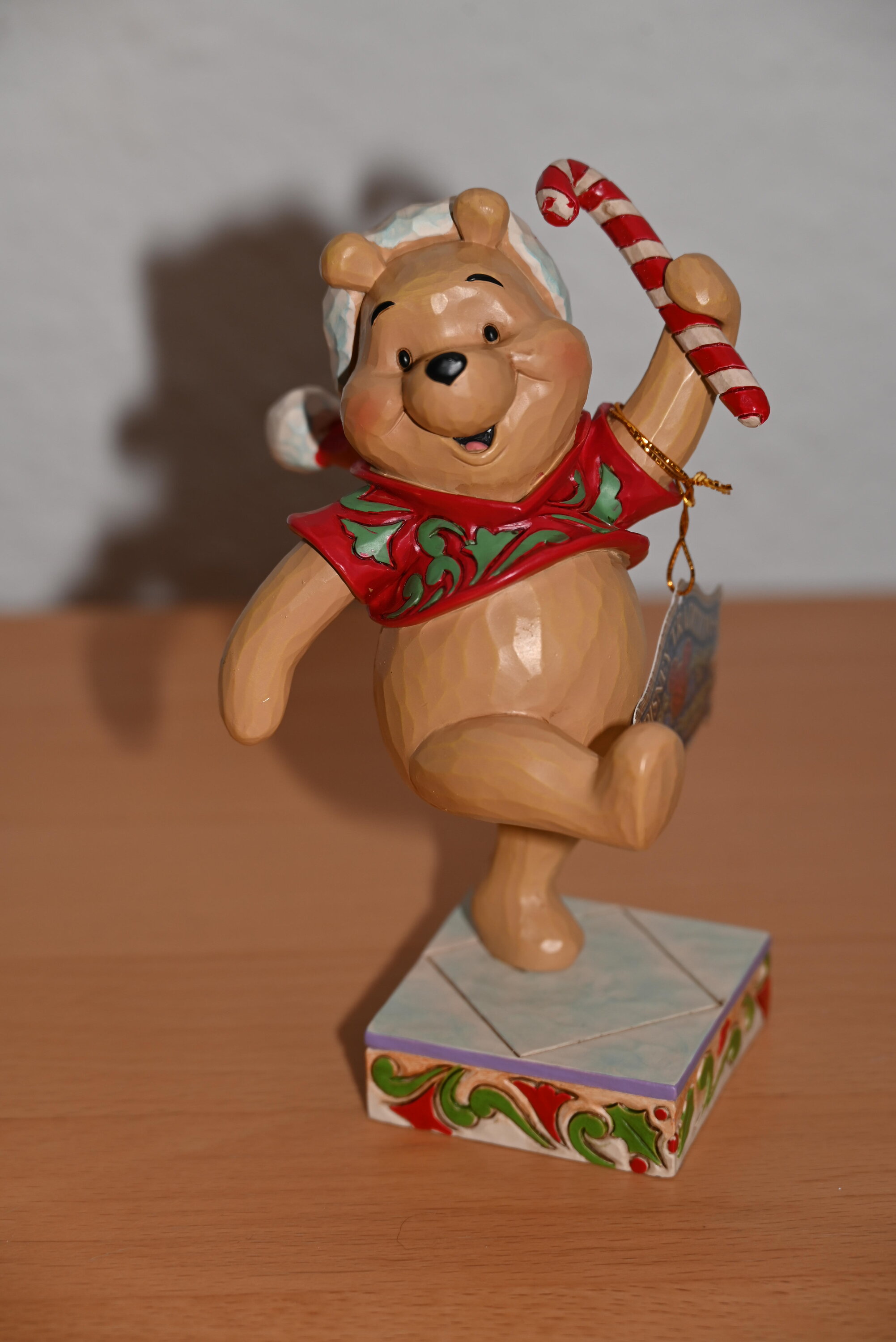 In cima alla sfilata di Natale, Winnie the Pooh entra nella vostra casa con stile e sorriso. Con il pep nella sua andatura, l'orso solleva un bastone di caramelle nell'aria. Indossa una camicia rosemaled e un berretto di Natale.