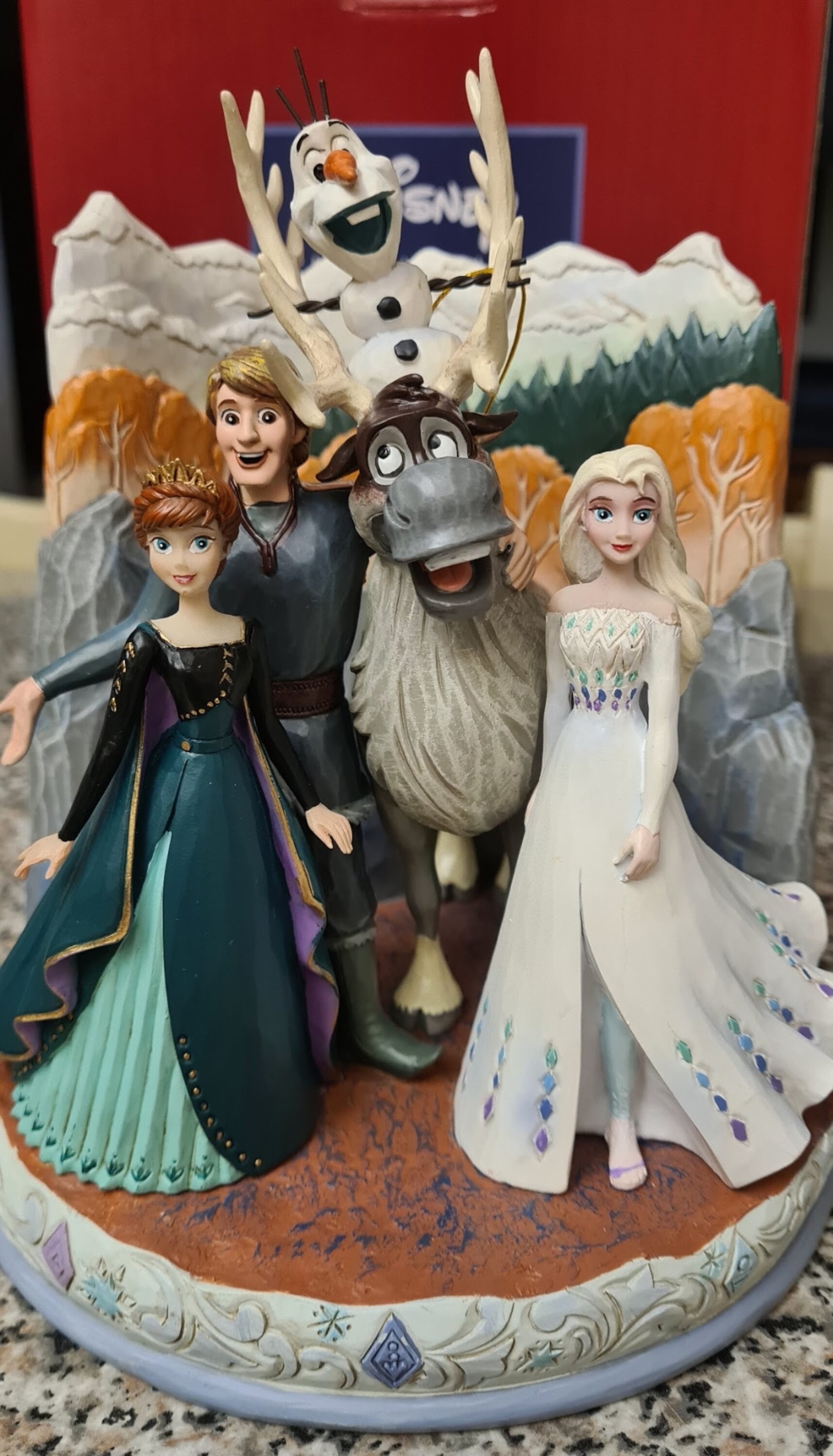 Comme d'habitude j'ai été émerveillé par cette œuvre d'art Disney Tradition qui vient compléter à merveille ma collection Jim Shore. Une belle photo de famille représentant les personnages identiques à ceux du film. Les détails sont réalisés avec une grande finesse. J'aime beaucoup les expressions des visages des personnages et nous pouvons retrouver la personnalité de chacun d'eux. Les tenues d'Elsa et d'Anna sont dignes d'un défilé de mode. Encore merci pour permettre à tous les amoureux des célèbres films de Walt Disney cette magnifique collection collection ❤️