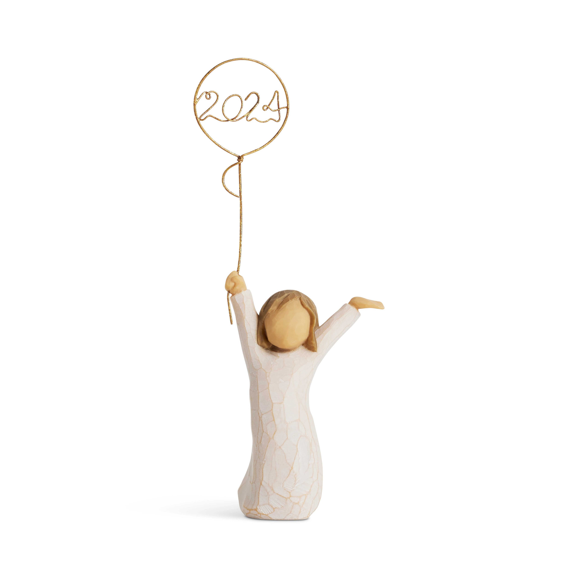 Regge tra le mani un palloncino in filo metallico dorato che incornicia l'anno 2024, evoca un esplosione di ottimismo.